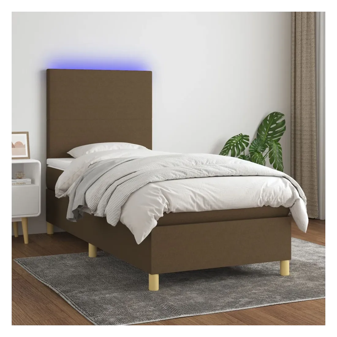 Utilisez ce sommier tapissier avec matelas et LED pour profiter d'un sommeil réparateur ! C'est le point central de votre chambre à coucher. Tissu durable : le tissu présente un aspect simple et épuré, et il est respirant et durable.Tête de lit pratique : la tête de lit est réglable en hauteur selon vos préférences. La tête de lit vous offre un excellent soutien du dos lorsque vous êtes assis dans votre lit pour lire ou regarder la télévision.Bande LED colorée : apportez de l'éclairage dans l'obscurité avec des lumières LED colorées !Matelas à ressorts ensachés : le ressort ensaché individuel intégré est connu pour sa très haute qualité tout en assurant un haut niveau de durabilité et d'adaptabilité. Il peut absorber efficacement le bruit et les chocs causés par les sauts et les rotations.Protège-matelas doux pour la peau : le protège-matelas est recouvert d'un tissu résistant et doux pour la peau, ce qui le rend souple et confortable. Remarque :Pour des raisons d'hygiène, le matelas ne peut pas être retourné si l'emballage est retiré ou ouvert.Seule la partie avec un symbole de ciseaux peut être coupée et seule la partie avec l'USB continuera à fonctionner comme avant.Chaque produit est livré avec un manuel de montage dans la boîte pour un montage facile.Ce produit est doté d'un connecteur USB, mais la source d'alimentation certifiée de USB 5V n'est pas incluse.
