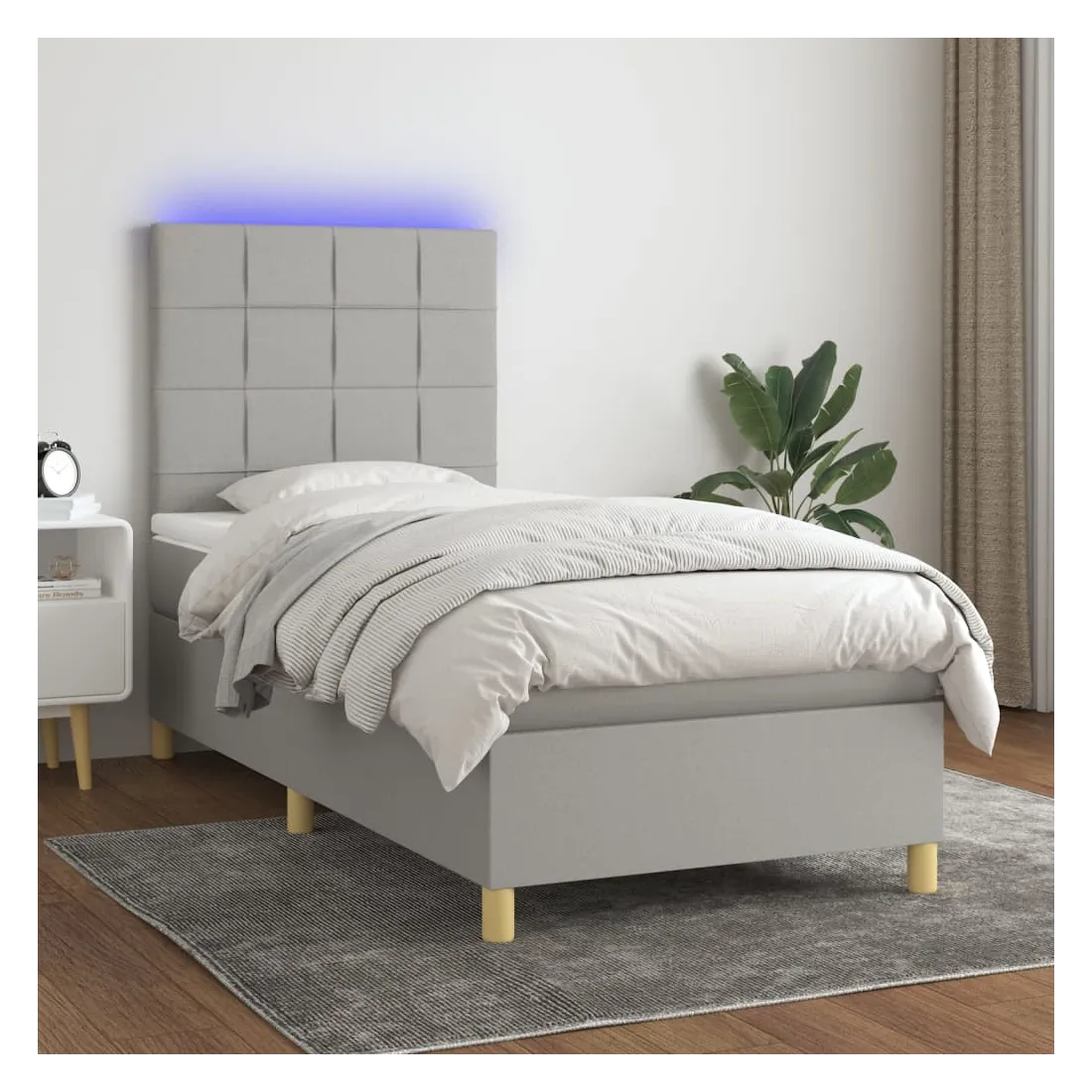Utilisez ce sommier tapissier avec matelas et LED pour profiter d'un sommeil réparateur ! C'est le point central de votre chambre à coucher. Tissu durable : le tissu présente un aspect simple et épuré, et il est respirant et durable.Tête de lit pratique : la tête de lit est réglable en hauteur selon vos préférences. La tête de lit vous offre un excellent soutien du dos lorsque vous êtes assis dans votre lit pour lire ou regarder la télévision.Bande LED colorée : apportez de l'éclairage dans l'obscurité avec des lumières LED colorées !Matelas à ressorts ensachés : le ressort ensaché individuel intégré est connu pour sa très haute qualité tout en assurant un haut niveau de durabilité et d'adaptabilité. Il peut absorber efficacement le bruit et les chocs causés par les sauts et les rotations.Protège-matelas doux pour la peau : le protège-matelas est recouvert d'un tissu résistant et doux pour la peau, ce qui le rend souple et confortable. Remarque :Pour des raisons d'hygiène, le matelas ne peut pas être retourné si l'emballage est retiré ou ouvert.Seule la partie avec un symbole de ciseaux peut être coupée et seule la partie avec l'USB continuera à fonctionner comme avant.Chaque produit est livré avec un manuel de montage dans la boîte pour un montage facile.Ce produit est doté d'un connecteur USB, mais la source d'alimentation certifiée de USB 5V n'est pas incluse.
