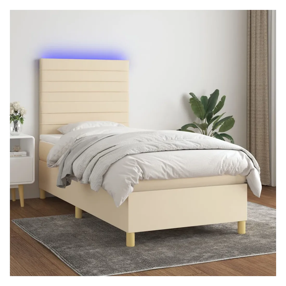 Utilisez ce sommier tapissier avec matelas et LED pour profiter d'un sommeil réparateur ! C'est le point central de votre chambre à coucher. Tissu durable : le tissu présente un aspect simple et épuré, et il est respirant et durable.Tête de lit pratique : la tête de lit est réglable en hauteur selon vos préférences. La tête de lit vous offre un excellent soutien du dos lorsque vous êtes assis dans votre lit pour lire ou regarder la télévision.Bande LED colorée : apportez de l'éclairage dans l'obscurité avec des lumières LED colorées !Matelas à ressorts ensachés : le ressort ensaché individuel intégré est connu pour sa très haute qualité tout en assurant un haut niveau de durabilité et d'adaptabilité. Il peut absorber efficacement le bruit et les chocs causés par les sauts et les rotations.Protège-matelas doux pour la peau : le protège-matelas est recouvert d'un tissu résistant et doux pour la peau, ce qui le rend souple et confortable. Remarque :Pour des raisons d'hygiène, le matelas ne peut pas être retourné si l'emballage est retiré ou ouvert.Seule la partie avec un symbole de ciseaux peut être coupée et seule la partie avec l'USB continuera à fonctionner comme avant.Chaque produit est livré avec un manuel de montage dans la boîte pour un montage facile.Ce produit est doté d'un connecteur USB, mais la source d'alimentation certifiée de USB 5V n'est pas incluse.