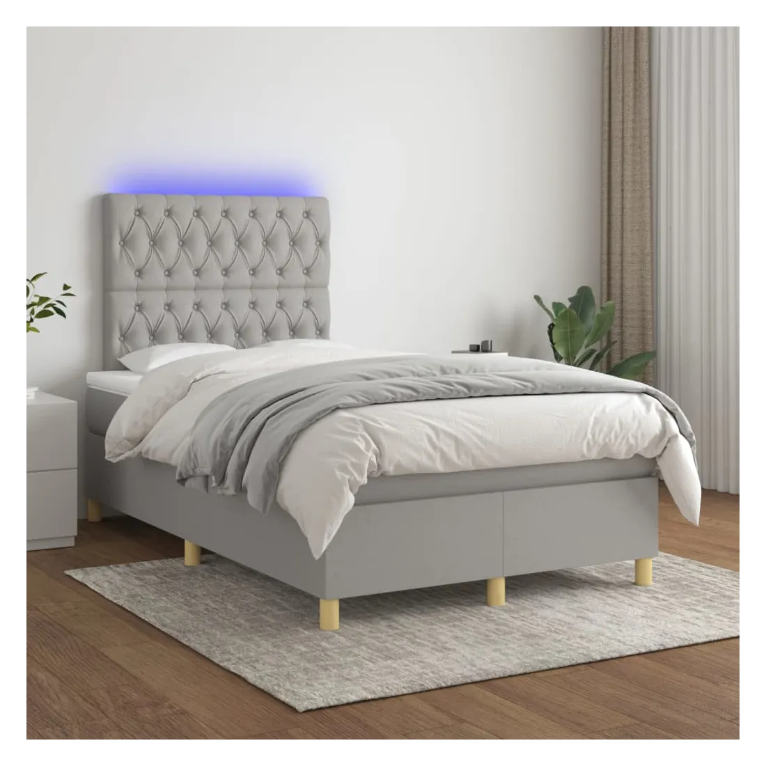 Utilisez ce sommier tapissier avec matelas et LED pour profiter d'un sommeil réparateur ! C'est le point central de votre chambre à coucher. Tissu durable : le tissu présente un aspect simple et épuré, et il est respirant et durable.Tête de lit pratique : la tête de lit est réglable en hauteur selon vos préférences. La tête de lit vous offre un excellent soutien du dos lorsque vous êtes assis dans votre lit pour lire ou regarder la télévision.Bande LED colorée : apportez de l'éclairage dans l'obscurité avec des lumières LED colorées !Matelas à ressorts ensachés : le ressort ensaché individuel intégré est connu pour sa très haute qualité tout en assurant un haut niveau de durabilité et d'adaptabilité. Il peut absorber efficacement le bruit et les chocs causés par les sauts et les rotations.Protège-matelas doux pour la peau : le protège-matelas est recouvert d'un tissu résistant et doux pour la peau, ce qui le rend souple et confortable. Remarque :Pour des raisons d'hygiène, le matelas ne peut pas être retourné si l'emballage est retiré ou ouvert.Seule la partie avec un symbole de ciseaux peut être coupée et seule la partie avec l'USB continuera à fonctionner comme avant.Chaque produit est livré avec un manuel de montage dans la boîte pour un montage facile.Ce produit est doté d'un connecteur USB, mais la source d'alimentation certifiée de USB 5V n'est pas incluse.