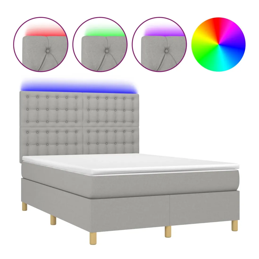 Utilisez ce sommier tapissier avec matelas et LED pour profiter d'un sommeil réparateur ! C'est le point central de votre chambre à coucher. Tissu durable : le tissu présente un aspect simple et épuré, et il est respirant et durable. Tête de lit pratique : la tête de lit est réglable en hauteur selon vos préférences. La tête de lit vous offre un excellent soutien du dos lorsque vous êtes assis dans votre lit pour lire ou regarder la télévision. Bande LED colorée : apportez de l'éclairage dans l'obscurité avec des lumières LED colorées ! Matelas à ressorts ensachés : le ressort ensaché individuel intégré est connu pour sa très haute qualité tout en assurant un haut niveau de durabilité et d'adaptabilité. Il peut absorber efficacement le bruit et les chocs causés par les sauts et les rot