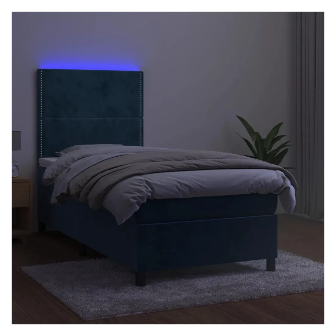 Utilisez ce sommier tapissier avec matelas et LED pour profiter d'un sommeil réparateur ! C'est le point central de votre chambre à coucher. Velours doux : le velours est un tissu doux et luxueux qui se reconnaît à son tas dense de fibres uniformément coupées qui ont une touche lisse. Le tissu en velours présente un toucher doux distinctif, ce qui le rend confortable au toucher.Tête de lit pratique : la tête de lit est réglable en hauteur selon vos préférences. La tête de lit vous offre un excellent soutien du dos lorsque vous êtes assis dans votre lit pour lire ou regarder la télévision.Bande LED colorée : apportez de l'éclairage dans l'obscurité avec des lumières LED colorées !Matelas à ressorts ensachés : le ressort ensaché individuel intégré est connu pour sa très haute qualité tout en assurant un haut niveau de durabilité et d'adaptabilité. Il peut absorber efficacement le bruit et les chocs causés par les sauts et les rotations.Protège-matelas doux pour la peau : le protège-matelas est recouvert d'un tissu résistant et doux pour la peau, ce qui le rend souple et confortable. Remarque :Pour des raisons d'hygiène, le matelas ne peut pas être retourné si l'emballage est retiré ou ouvert.Seule la partie avec un symbole de ciseaux peut être coupée et seule la partie avec l'USB continuera à fonctionner comme avant.Chaque produit est livré avec un manuel de montage dans la boîte pour un montage facile.Ce produit est doté d'un connecteur USB, mais la source d'alimentation certifiée de USB 5V n'est pas incluse.