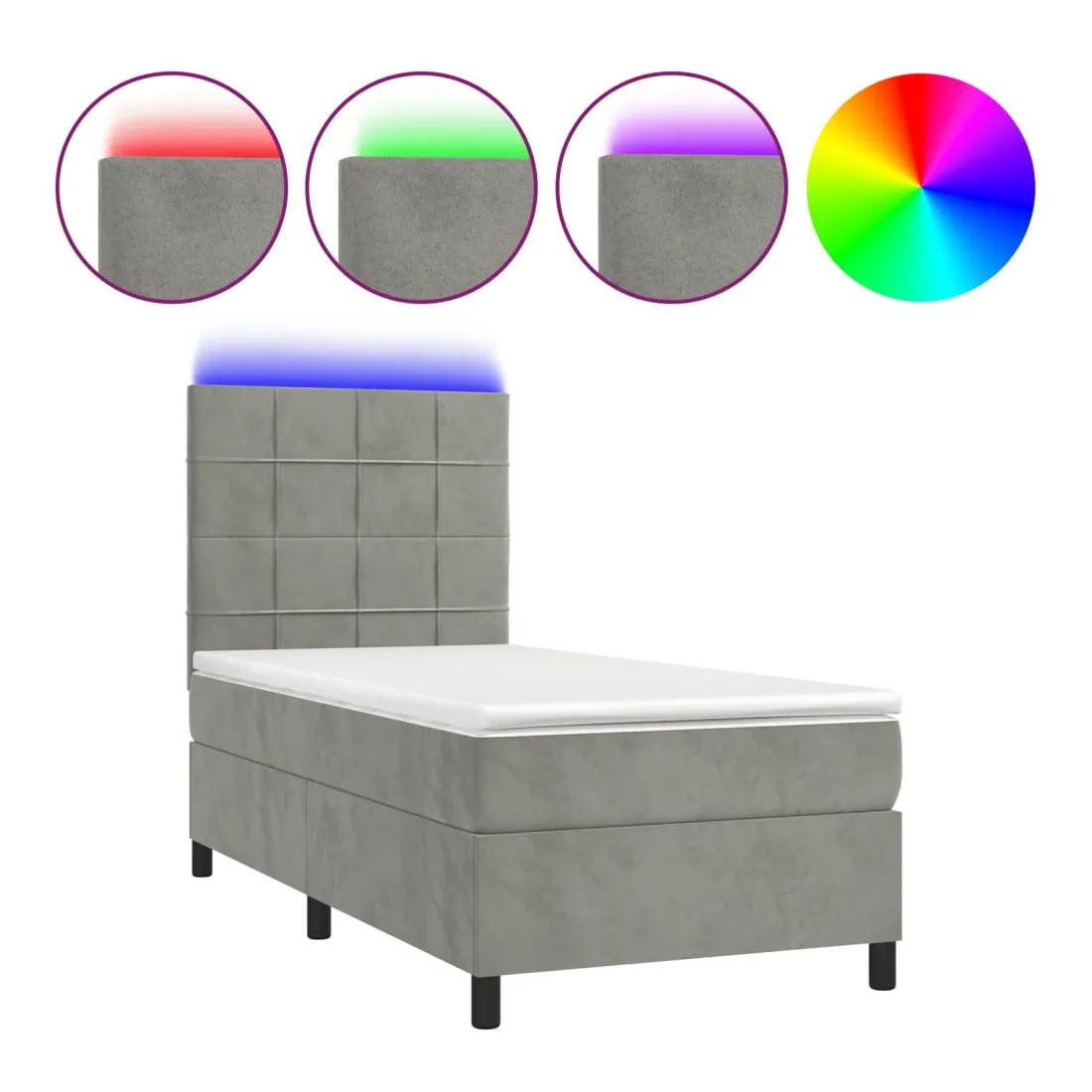 Utilisez ce sommier tapissier avec matelas et LED pour profiter d'un sommeil réparateur ! C'est le point central de votre chambre à coucher. Velours doux : le velours est un tissu doux et luxueux qui se reconnaît à son tas dense de fibres uniformément coupées qui ont une touche lisse. Le tissu en velours présente un toucher doux distinctif, ce qui le rend confortable au toucher.Tête de lit pratique : la tête de lit est réglable en hauteur selon vos préférences. La tête de lit vous offre un excellent soutien du dos lorsque vous êtes assis dans votre lit pour lire ou regarder la télévision.Bande LED colorée : apportez de l'éclairage dans l'obscurité avec des lumières LED colorées !Matelas à ressorts ensachés : le ressort ensaché individuel intégré est connu pour sa très haute qualité tout en assurant un haut niveau de durabilité et d'adaptabilité. Il peut absorber efficacement le bruit et les chocs causés par les sauts et les rotations.Protège-matelas doux pour la peau : le protège-matelas est recouvert d'un tissu résistant et doux pour la peau, ce qui le rend souple et confortable. Remarque :Pour des raisons d'hygiène, le matelas ne peut pas être retourné si l'emballage est retiré ou ouvert.Seule la partie avec un symbole de ciseaux peut être coupée et seule la partie avec l'USB continuera à fonctionner comme avant.Chaque produit est livré avec un manuel de montage dans la boîte pour un montage facile.Ce produit est doté d'un connecteur USB, mais la source d'alimentation certifiée de USB 5V n'est pas incluse.