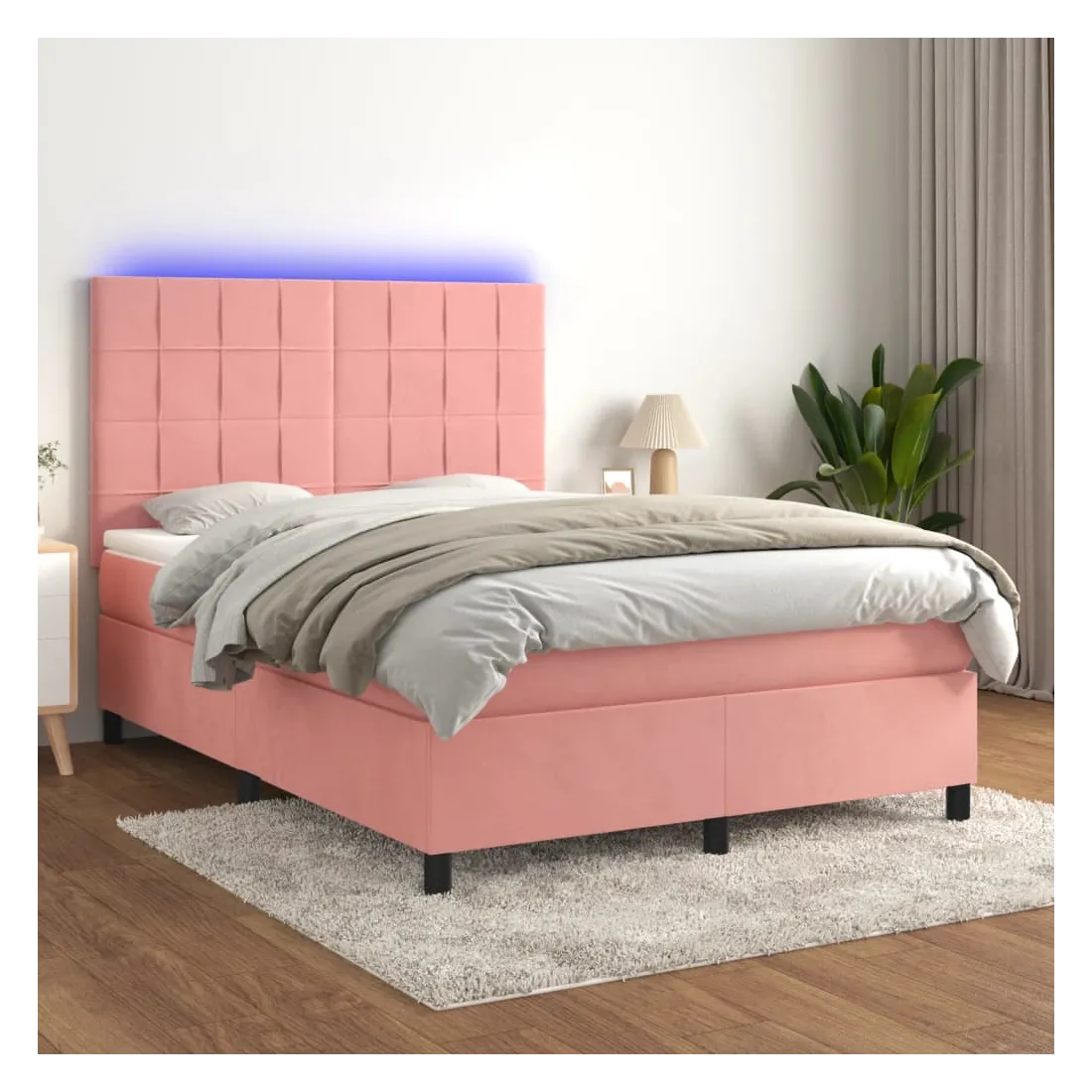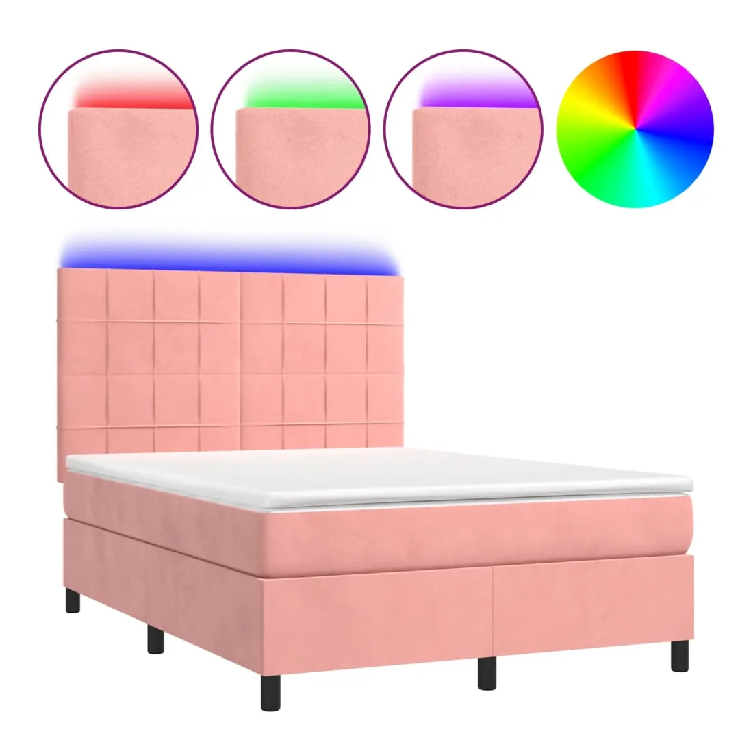 Utilisez ce sommier tapissier avec matelas et LED pour profiter d'un sommeil réparateur ! C'est le point central de votre chambre à coucher. Velours doux : le velours est un tissu doux et luxueux qui se reconnaît à son tas dense de fibres uniformément coupées qui ont une touche lisse. Le tissu en velours présente un toucher doux distinctif, ce qui le rend confortable au toucher.Tête de lit pratique : la tête de lit est réglable en hauteur selon vos préférences. La tête de lit vous offre un excellent soutien du dos lorsque vous êtes assis dans votre lit pour lire ou regarder la télévision.Bande LED colorée : apportez de l'éclairage dans l'obscurité avec des lumières LED colorées !Matelas à ressorts ensachés : le ressort ensaché individuel intégré est connu pour sa très haute qualité tout en assurant un haut niveau de durabilité et d'adaptabilité. Il peut absorber efficacement le bruit et les chocs causés par les sauts et les rotations.Protège-matelas doux pour la peau : le protège-matelas est recouvert d'un tissu résistant et doux pour la peau, ce qui le rend souple et confortable. Remarque :Pour des raisons d'hygiène, le matelas ne peut pas être retourné si l'emballage est retiré ou ouvert.Seule la partie avec un symbole de ciseaux peut être coupée et seule la partie avec l'USB continuera à fonctionner comme avant.Chaque produit est livré avec un manuel de montage dans la boîte pour un montage facile.Ce produit est doté d'un connecteur USB, mais la source d'alimentation certifiée de USB 5V n'est pas incluse.