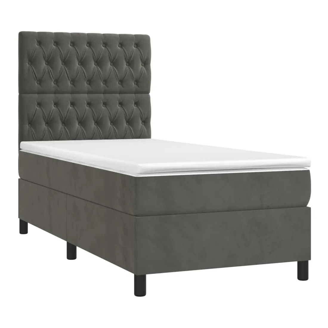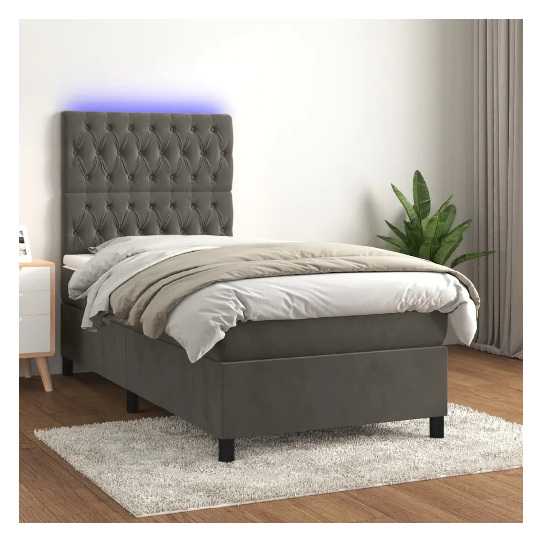 Utilisez ce sommier tapissier avec matelas et LED pour profiter d'un sommeil réparateur ! C'est le point central de votre chambre à coucher. Velours doux : le velours est un tissu doux et luxueux qui se reconnaît à son tas dense de fibres uniformément coupées qui ont une touche lisse. Le tissu en velours présente un toucher doux distinctif, ce qui le rend confortable au toucher.Tête de lit pratique : la tête de lit est réglable en hauteur selon vos préférences. La tête de lit vous offre un excellent soutien du dos lorsque vous êtes assis dans votre lit pour lire ou regarder la télévision.Bande LED colorée : apportez de l'éclairage dans l'obscurité avec des lumières LED colorées !Matelas à ressorts ensachés : le ressort ensaché individuel intégré est connu pour sa très haute qualité tout en assurant un haut niveau de durabilité et d'adaptabilité. Il peut absorber efficacement le bruit et les chocs causés par les sauts et les rotations.Protège-matelas doux pour la peau : le protège-matelas est recouvert d'un tissu résistant et doux pour la peau, ce qui le rend souple et confortable. Remarque :Pour des raisons d'hygiène, le matelas ne peut pas être retourné si l'emballage est retiré ou ouvert.Seule la partie avec un symbole de ciseaux peut être coupée et seule la partie avec l'USB continuera à fonctionner comme avant.Chaque produit est livré avec un manuel de montage dans la boîte pour un montage facile.Ce produit est doté d'un connecteur USB, mais la source d'alimentation certifiée de USB 5V n'est pas incluse.