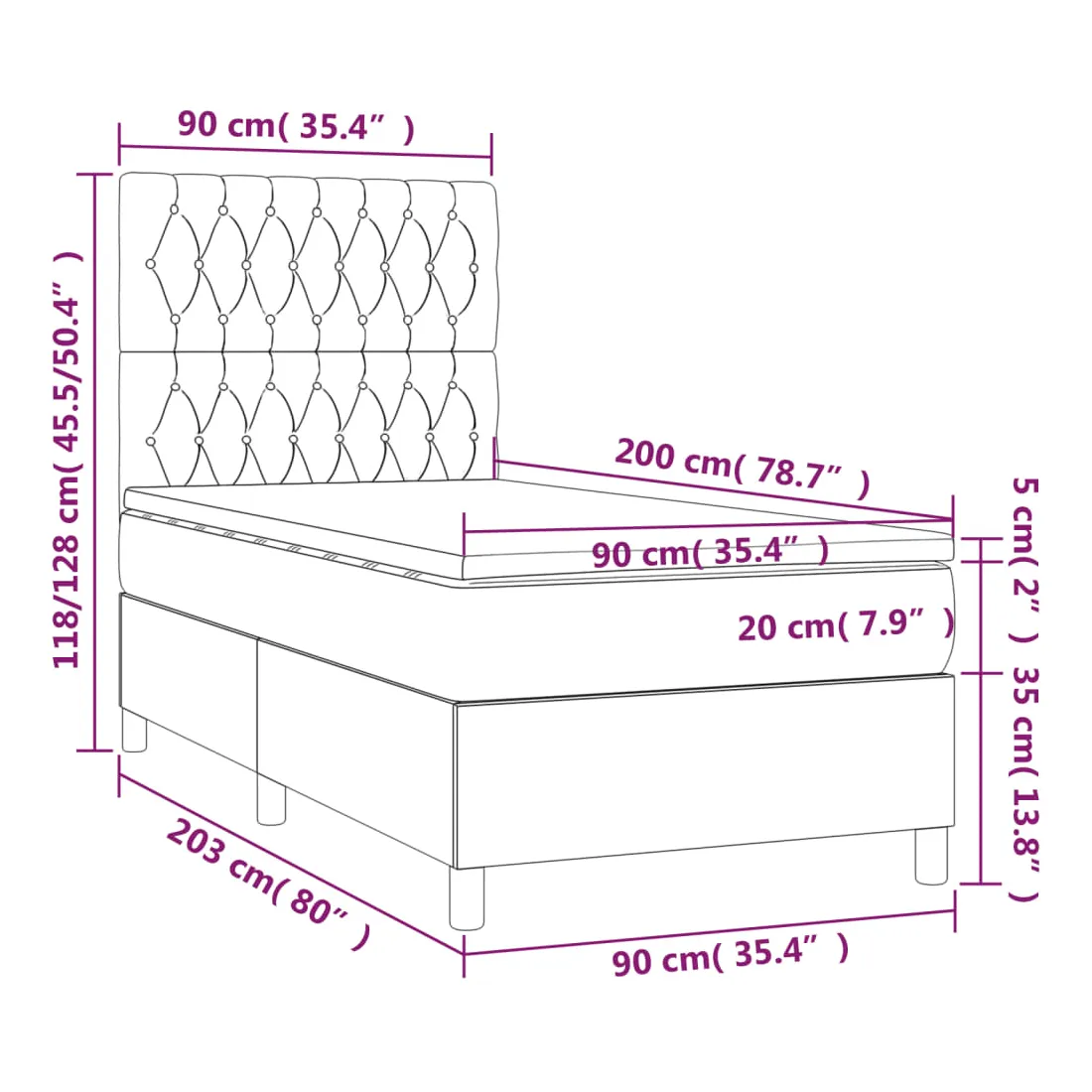 - Dimensions totales : 203 x 90 x 118/128 cm (L x l x H)