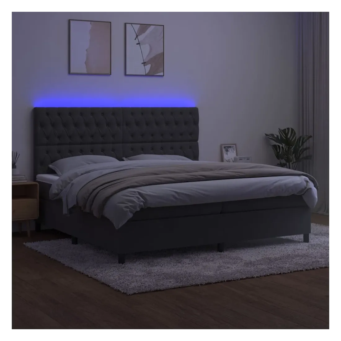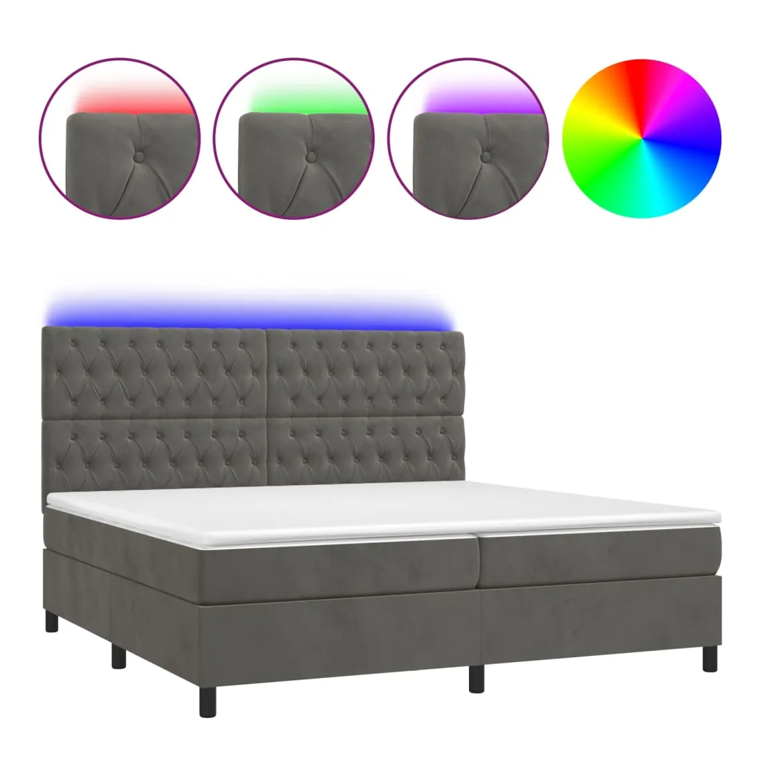 Utilisez ce sommier tapissier avec matelas et LED pour profiter d'un sommeil réparateur ! C'est le point central de votre chambre à coucher. Velours doux : le velours est un tissu doux et luxueux qui se reconnaît à son tas dense de fibres uniformément coupées qui ont une touche lisse. Le tissu en velours présente un toucher doux distinctif, ce qui le rend confortable au toucher.Tête de lit pratique : la tête de lit est réglable en hauteur selon vos préférences. La tête de lit vous offre un excellent soutien du dos lorsque vous êtes assis dans votre lit pour lire ou regarder la télévision.Bande LED colorée : apportez de l'éclairage dans l'obscurité avec des lumières LED colorées !Matelas à ressorts ensachés : le ressort ensaché individuel intégré est connu pour sa très haute qualité tout en assurant un haut niveau de durabilité et d'adaptabilité. Il peut absorber efficacement le bruit et les chocs causés par les sauts et les rotations.Protège-matelas doux pour la peau : le protège-matelas est recouvert d'un tissu résistant et doux pour la peau, ce qui le rend souple et confortable. Remarque :Pour des raisons d'hygiène, le matelas ne peut pas être retourné si l'emballage est retiré ou ouvert.Seule la partie avec un symbole de ciseaux peut être coupée et seule la partie avec l'USB continuera à fonctionner comme avant.Chaque produit est livré avec un manuel de montage dans la boîte pour un montage facile.Ce produit est doté d'un connecteur USB, mais la source d'alimentation certifiée de USB 5V n'est pas incluse.