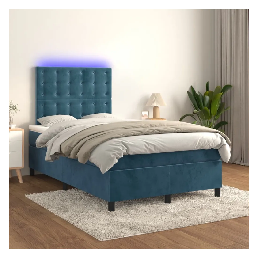 Utilisez ce sommier tapissier avec matelas et LED pour profiter d'un sommeil réparateur ! C'est le point central de votre chambre à coucher. Velours doux : le velours est un tissu doux et luxueux qui se reconnaît à son tas dense de fibres uniformément coupées qui ont une touche lisse. Le tissu en velours présente un toucher doux distinctif, ce qui le rend confortable au toucher.Tête de lit pratique : la tête de lit est réglable en hauteur selon vos préférences. La tête de lit vous offre un excellent soutien du dos lorsque vous êtes assis dans votre lit pour lire ou regarder la télévision.Bande LED colorée : apportez de l'éclairage dans l'obscurité avec des lumières LED colorées !Matelas à ressorts ensachés : le ressort ensaché individuel intégré est connu pour sa très haute qualité tout en assurant un haut niveau de durabilité et d'adaptabilité. Il peut absorber efficacement le bruit et les chocs causés par les sauts et les rotations.Protège-matelas doux pour la peau : le protège-matelas est recouvert d'un tissu résistant et doux pour la peau, ce qui le rend souple et confortable. Remarque :Pour des raisons d'hygiène, le matelas ne peut pas être retourné si l'emballage est retiré ou ouvert.Seule la partie avec un symbole de ciseaux peut être coupée et seule la partie avec l'USB continuera à fonctionner comme avant.Chaque produit est livré avec un manuel de montage dans la boîte pour un montage facile.Ce produit est doté d'un connecteur USB, mais la source d'alimentation certifiée de USB 5V n'est pas incluse.