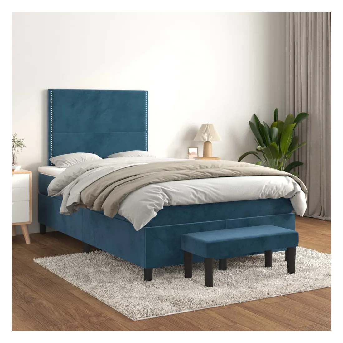 Utilisez ce lit à sommier pour profiter d'une nuit de sommeil réparatrice ! Il vous offre une relaxation maximale et un sommeil agréable. Velours doux : le velours est un tissu doux et luxueux qui se reconnaît à son tas dense de fibres uniformément coupées qui ont une touche lisse. Le tissu en velours présente un toucher doux distinctif, ce qui le rend confortable au toucher.Tête de lit pratique : la tête de lit est réglable en hauteur selon vos préférences. La tête de lit vous offre un excellent soutien du dos lorsque vous êtes assis dans votre lit pour lire ou regarder la télévision.Matelas à ressorts ensachés : le ressort ensaché individuel intégré est connu pour sa très haute qualité tout en assurant un haut niveau de durabilité et d'adaptabilité. Il peut absorber efficacement le bruit et les chocs causés par les sauts et les rotations.Support moyen-dur : ce matelas de lit offre une stabilité accrue et juste le niveau de fermeté sans sacrifier le confort. Il est donc idéal pour les personnes qui dorment sur le dos ou sur le ventre.Protège-matelas doux pour la peau : le protège-matelas est recouvert d'un tissu résistant et doux pour la peau, ce qui le rend souple et confortable.Banc multifonctionnel : ce banc peut servir de siège supplémentaire dans votre maison. Il peut également être utilisé comme banc de bout de lit. Remarque :Pour des raisons d'hygiène, le matelas ne peut pas être retourné si l'emballage est retiré ou ouvert.Chaque produit est livré avec un manuel de montage dans la boîte pour un montage facile.