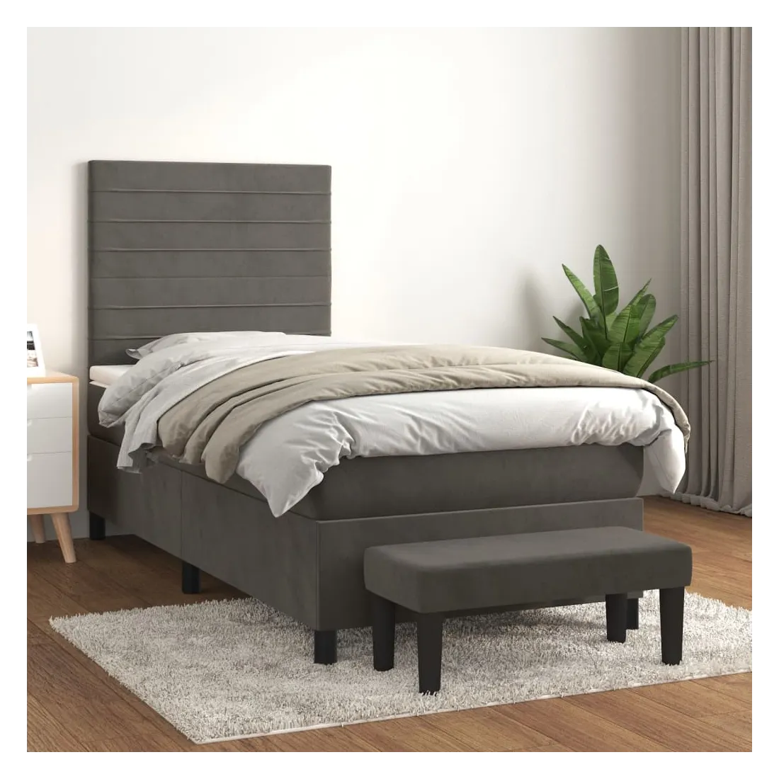 Utilisez ce lit à sommier pour profiter d'une nuit de sommeil réparatrice ! Il vous offre une relaxation maximale et un sommeil agréable. Velours doux : le velours est un tissu doux et luxueux qui se reconnaît à son tas dense de fibres uniformément coupées qui ont une touche lisse. Le tissu en velours présente un toucher doux distinctif, ce qui le rend confortable au toucher.Tête de lit pratique : la tête de lit est réglable en hauteur selon vos préférences. La tête de lit vous offre un excellent soutien du dos lorsque vous êtes assis dans votre lit pour lire ou regarder la télévision.Matelas à ressorts ensachés : le ressort ensaché individuel intégré est connu pour sa très haute qualité tout en assurant un haut niveau de durabilité et d'adaptabilité. Il peut absorber efficacement le bruit et les chocs causés par les sauts et les rotations.Support moyen-dur : ce matelas de lit offre une stabilité accrue et juste le niveau de fermeté sans sacrifier le confort. Il est donc idéal pour les personnes qui dorment sur le dos ou sur le ventre.Protège-matelas doux pour la peau : le protège-matelas est recouvert d'un tissu résistant et doux pour la peau, ce qui le rend souple et confortable.Banc multifonctionnel : ce banc peut servir de siège supplémentaire dans votre maison. Il peut également être utilisé comme banc de bout de lit. Remarque :Pour des raisons d'hygiène, le matelas ne peut pas être retourné si l'emballage est retiré ou ouvert.Chaque produit est livré avec un manuel de montage dans la boîte pour un montage facile.