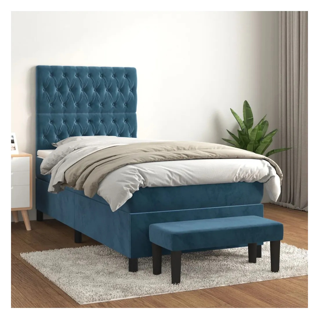 Utilisez ce lit à sommier pour profiter d'une nuit de sommeil réparatrice ! Il vous offre une relaxation maximale et un sommeil agréable. Velours doux : le velours est un tissu doux et luxueux qui se reconnaît à son tas dense de fibres uniformément coupées qui ont une touche lisse. Le tissu en velours présente un toucher doux distinctif, ce qui le rend confortable au toucher.Tête de lit pratique : la tête de lit est réglable en hauteur selon vos préférences. La tête de lit vous offre un excellent soutien du dos lorsque vous êtes assis dans votre lit pour lire ou regarder la télévision.Matelas à ressorts ensachés : le ressort ensaché individuel intégré est connu pour sa très haute qualité tout en assurant un haut niveau de durabilité et d'adaptabilité. Il peut absorber efficacement le bruit et les chocs causés par les sauts et les rotations.Support moyen-dur : ce matelas de lit offre une stabilité accrue et juste le niveau de fermeté sans sacrifier le confort. Il est donc idéal pour les personnes qui dorment sur le dos ou sur le ventre.Protège-matelas doux pour la peau : le protège-matelas est recouvert d'un tissu résistant et doux pour la peau, ce qui le rend souple et confortable.Banc multifonctionnel : ce banc peut servir de siège supplémentaire dans votre maison. Il peut également être utilisé comme banc de bout de lit. Remarque :Pour des raisons d'hygiène, le matelas ne peut pas être retourné si l'emballage est retiré ou ouvert.Chaque produit est livré avec un manuel de montage dans la boîte pour un montage facile.