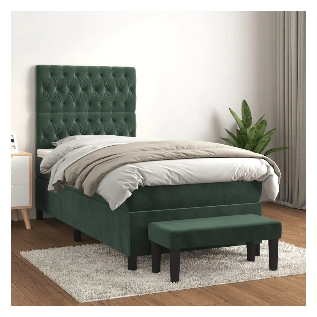 Utilisez ce lit à sommier pour profiter d'une nuit de sommeil réparatrice ! Il vous offre une relaxation maximale et un sommeil agréable. Velours doux : le velours est un tissu doux et luxueux qui se reconnaît à son tas dense de fibres uniformément coupées qui ont une touche lisse. Le tissu en velours présente un toucher doux distinctif, ce qui le rend confortable au toucher.Tête de lit pratique : la tête de lit est réglable en hauteur selon vos préférences. La tête de lit vous offre un excellent soutien du dos lorsque vous êtes assis dans votre lit pour lire ou regarder la télévision.Matelas à ressorts ensachés : le ressort ensaché individuel intégré est connu pour sa très haute qualité tout en assurant un haut niveau de durabilité et d'adaptabilité. Il peut absorber efficacement le bruit et les chocs causés par les sauts et les rotations.Support moyen-dur : ce matelas de lit offre une stabilité accrue et juste le niveau de fermeté sans sacrifier le confort. Il est donc idéal pour les personnes qui dorment sur le dos ou sur le ventre.Protège-matelas doux pour la peau : le protège-matelas est recouvert d'un tissu résistant et doux pour la peau, ce qui le rend souple et confortable.Banc multifonctionnel : ce banc peut servir de siège supplémentaire dans votre maison. Il peut également être utilisé comme banc de bout de lit. Remarque :Pour des raisons d'hygiène, le matelas ne peut pas être retourné si l'emballage est retiré ou ouvert.Chaque produit est livré avec un manuel de montage dans la boîte pour un montage facile.
