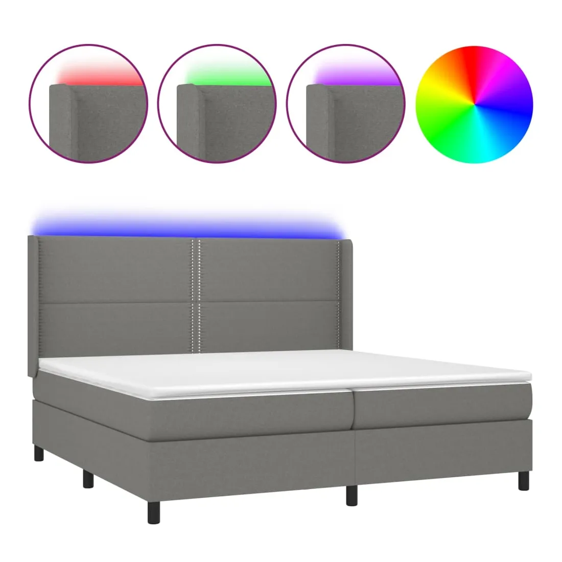Utilisez ce sommier tapissier avec matelas et LED pour profiter d'un sommeil réparateur ! C'est le point central de votre chambre à coucher. Tissu durable : le tissu présente un aspect simple et épuré, et il est respirant et durable.Tête de lit pratique : la tête de lit est réglable en hauteur selon vos préférences. La tête de lit vous offre un excellent soutien du dos lorsque vous êtes assis dans votre lit pour lire ou regarder la télévision.Bande LED colorée : apportez de l'éclairage dans l'obscurité avec des lumières LED colorées !Matelas à ressorts ensachés : le ressort ensaché individuel intégré est connu pour sa très haute qualité tout en assurant un haut niveau de durabilité et d'adaptabilité. Il peut absorber efficacement le bruit et les chocs causés par les sauts et les rotations.Protège-matelas doux pour la peau : le protège-matelas est recouvert d'un tissu résistant et doux pour la peau, ce qui le rend souple et confortable. Remarque :Pour des raisons d'hygiène, le matelas ne peut pas être retourné si l'emballage est retiré ou ouvert.Seule la partie avec un symbole de ciseaux peut être coupée et seule la partie avec l'USB continuera à fonctionner comme avant.Chaque produit est livré avec un manuel de montage dans la boîte pour un montage facile.Ce produit est doté d'un connecteur USB, mais la source d'alimentation certifiée de USB 5V n'est pas incluse.