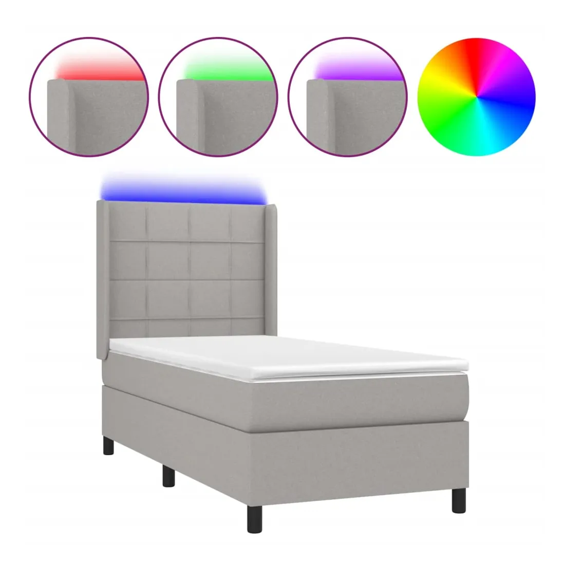Utilisez ce sommier tapissier avec matelas et LED pour profiter d'un sommeil réparateur ! C'est le point central de votre chambre à coucher. Tissu durable : le tissu présente un aspect simple et épuré, et il est respirant et durable.Tête de lit pratique : la tête de lit est réglable en hauteur selon vos préférences. La tête de lit vous offre un excellent soutien du dos lorsque vous êtes assis dans votre lit pour lire ou regarder la télévision.Bande LED colorée : apportez de l'éclairage dans l'obscurité avec des lumières LED colorées !Matelas à ressorts ensachés : le ressort ensaché individuel intégré est connu pour sa très haute qualité tout en assurant un haut niveau de durabilité et d'adaptabilité. Il peut absorber efficacement le bruit et les chocs causés par les sauts et les rotations.Protège-matelas doux pour la peau : le protège-matelas est recouvert d'un tissu résistant et doux pour la peau, ce qui le rend souple et confortable. Remarque :Pour des raisons d'hygiène, le matelas ne peut pas être retourné si l'emballage est retiré ou ouvert.Seule la partie avec un symbole de ciseaux peut être coupée et seule la partie avec l'USB continuera à fonctionner comme avant.Chaque produit est livré avec un manuel de montage dans la boîte pour un montage facile.Ce produit est doté d'un connecteur USB, mais la source d'alimentation certifiée de USB 5V n'est pas incluse.