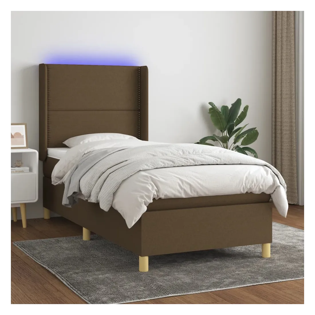 Utilisez ce sommier tapissier avec matelas et LED pour profiter d'un sommeil réparateur ! C'est le point central de votre chambre à coucher. Tissu durable : le tissu présente un aspect simple et épuré, et il est respirant et durable.Tête de lit pratique : la tête de lit est réglable en hauteur selon vos préférences. La tête de lit vous offre un excellent soutien du dos lorsque vous êtes assis dans votre lit pour lire ou regarder la télévision.Bande LED colorée : apportez de l'éclairage dans l'obscurité avec des lumières LED colorées !Matelas à ressorts ensachés : le ressort ensaché individuel intégré est connu pour sa très haute qualité tout en assurant un haut niveau de durabilité et d'adaptabilité. Il peut absorber efficacement le bruit et les chocs causés par les sauts et les rotations.Protège-matelas doux pour la peau : le protège-matelas est recouvert d'un tissu résistant et doux pour la peau, ce qui le rend souple et confortable. Remarque :Pour des raisons d'hygiène, le matelas ne peut pas être retourné si l'emballage est retiré ou ouvert.Seule la partie avec un symbole de ciseaux peut être coupée et seule la partie avec l'USB continuera à fonctionner comme avant.Chaque produit est livré avec un manuel de montage dans la boîte pour un montage facile.Ce produit est doté d'un connecteur USB, mais la source d'alimentation certifiée de USB 5V n'est pas incluse.