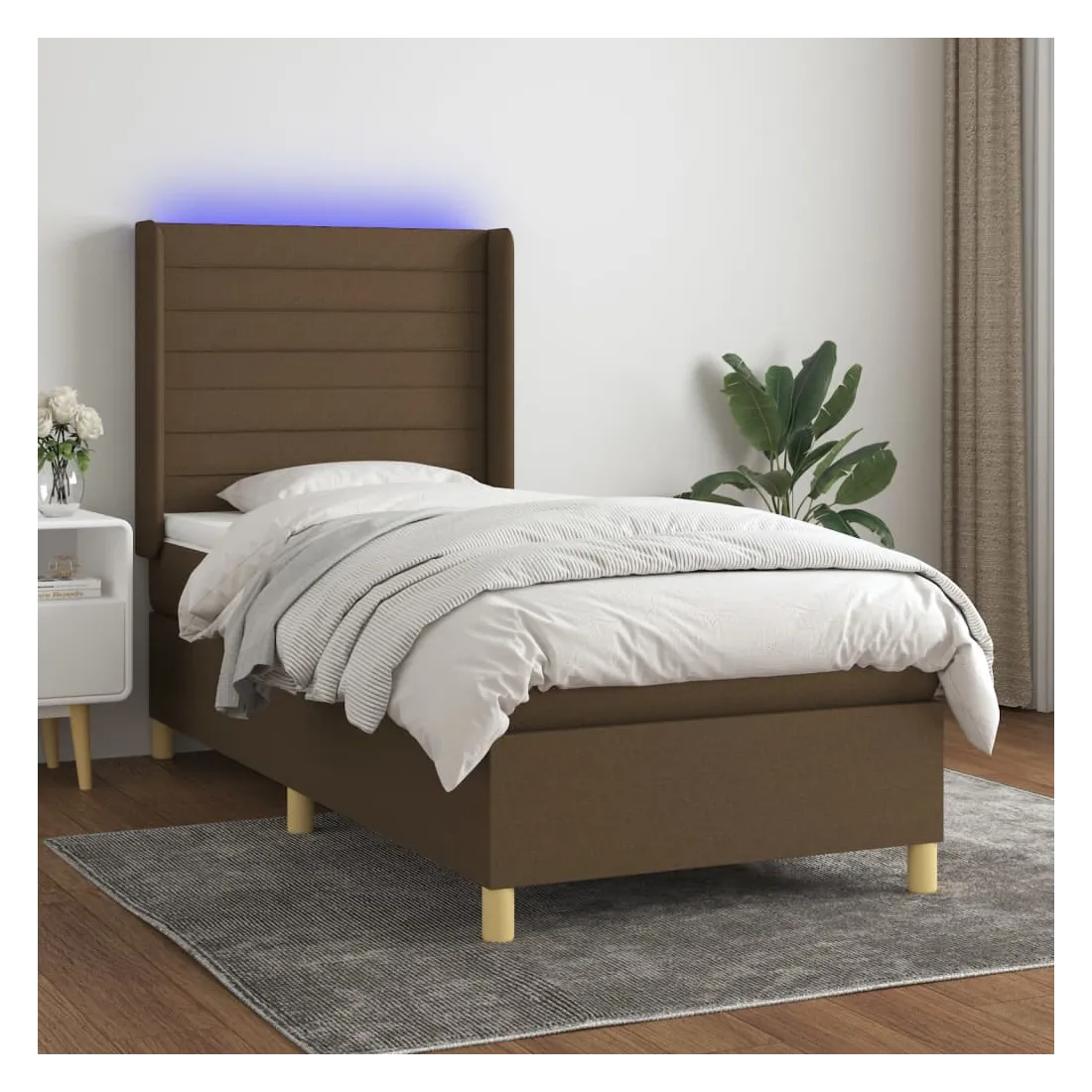 Utilisez ce sommier tapissier avec matelas et LED pour profiter d'un sommeil réparateur ! C'est le point central de votre chambre à coucher. Tissu durable : le tissu présente un aspect simple et épuré, et il est respirant et durable.Tête de lit pratique : la tête de lit est réglable en hauteur selon vos préférences. La tête de lit vous offre un excellent soutien du dos lorsque vous êtes assis dans votre lit pour lire ou regarder la télévision.Bande LED colorée : apportez de l'éclairage dans l'obscurité avec des lumières LED colorées !Matelas à ressorts ensachés : le ressort ensaché individuel intégré est connu pour sa très haute qualité tout en assurant un haut niveau de durabilité et d'adaptabilité. Il peut absorber efficacement le bruit et les chocs causés par les sauts et les rotations.Protège-matelas doux pour la peau : le protège-matelas est recouvert d'un tissu résistant et doux pour la peau, ce qui le rend souple et confortable. Remarque :Pour des raisons d'hygiène, le matelas ne peut pas être retourné si l'emballage est retiré ou ouvert.Seule la partie avec un symbole de ciseaux peut être coupée et seule la partie avec l'USB continuera à fonctionner comme avant.Chaque produit est livré avec un manuel de montage dans la boîte pour un montage facile.Ce produit est doté d'un connecteur USB, mais la source d'alimentation certifiée de USB 5V n'est pas incluse.