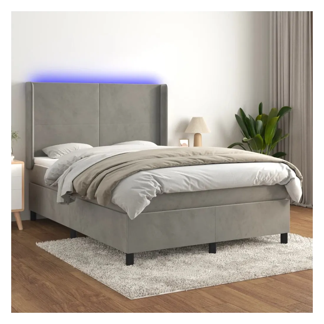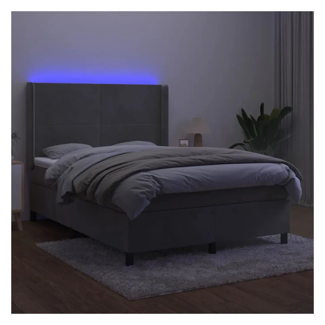 Utilisez ce sommier tapissier avec matelas et LED pour profiter d'un sommeil réparateur ! C'est le point central de votre chambre à coucher. Velours doux : le velours est un tissu doux et luxueux qui se reconnaît à son tas dense de fibres uniformément coupées qui ont une touche lisse. Le tissu en velours présente un toucher doux distinctif, ce qui le rend confortable au toucher.Tête de lit pratique : la tête de lit est réglable en hauteur selon vos préférences. La tête de lit vous offre un excellent soutien du dos lorsque vous êtes assis dans votre lit pour lire ou regarder la télévision.Bande LED colorée : apportez de l'éclairage dans l'obscurité avec des lumières LED colorées !Matelas à ressorts ensachés : le ressort ensaché individuel intégré est connu pour sa très haute qualité tout en assurant un haut niveau de durabilité et d'adaptabilité. Il peut absorber efficacement le bruit et les chocs causés par les sauts et les rotations.Protège-matelas doux pour la peau : le protège-matelas est recouvert d'un tissu résistant et doux pour la peau, ce qui le rend souple et confortable. Remarque :Pour des raisons d'hygiène, le matelas ne peut pas être retourné si l'emballage est retiré ou ouvert.Seule la partie avec un symbole de ciseaux peut être coupée et seule la partie avec l'USB continuera à fonctionner comme avant.Chaque produit est livré avec un manuel de montage dans la boîte pour un montage facile.Ce produit est doté d'un connecteur USB, mais la source d'alimentation certifiée de USB 5V n'est pas incluse.