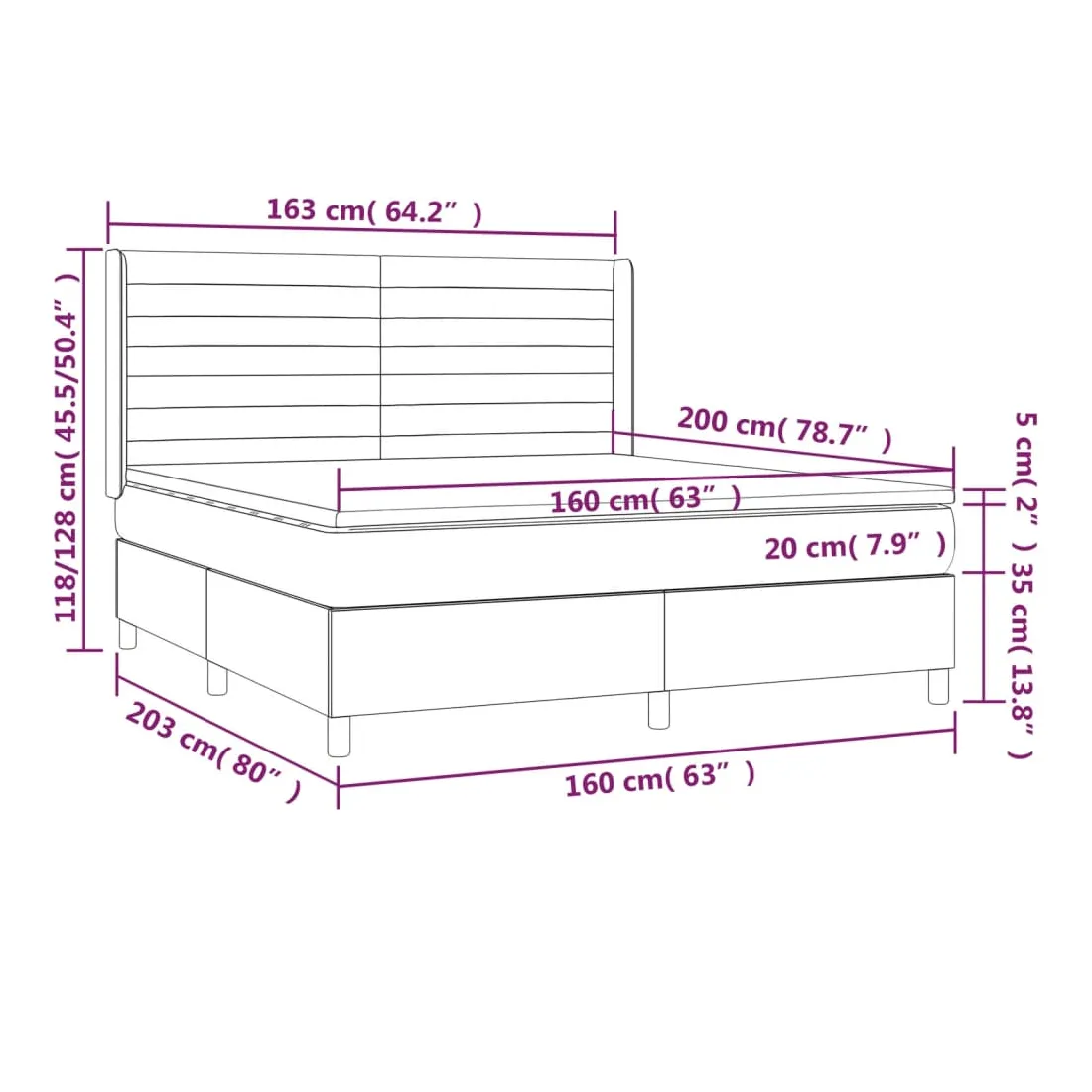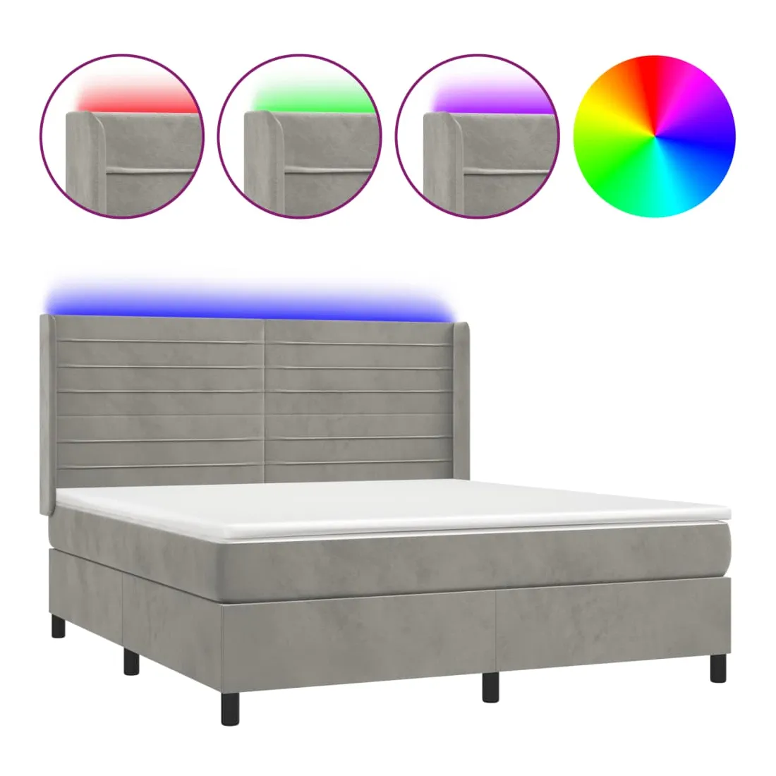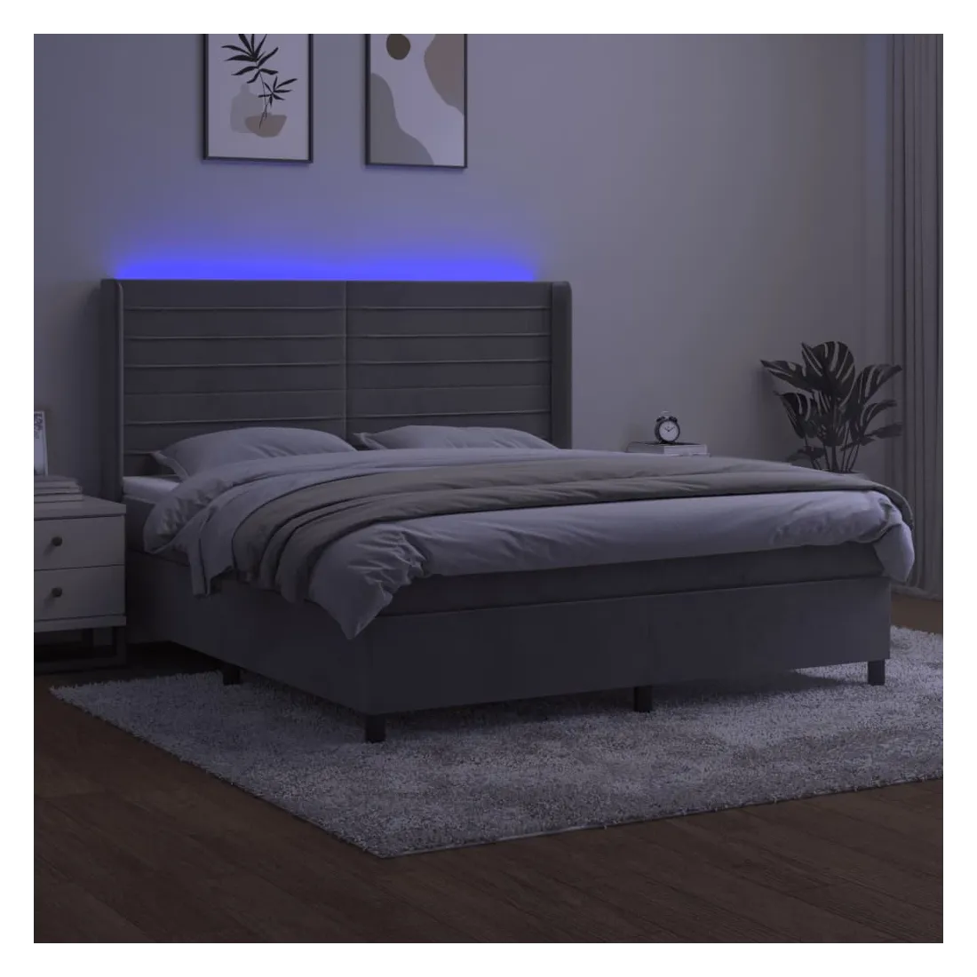 Utilisez ce sommier tapissier avec matelas et LED pour profiter d'un sommeil réparateur ! C'est le point central de votre chambre à coucher. Velours doux : le velours est un tissu doux et luxueux qui se reconnaît à son tas dense de fibres uniformément coupées qui ont une touche lisse. Le tissu en velours présente un toucher doux distinctif, ce qui le rend confortable au toucher.Tête de lit pratique : la tête de lit est réglable en hauteur selon vos préférences. La tête de lit vous offre un excellent soutien du dos lorsque vous êtes assis dans votre lit pour lire ou regarder la télévision.Bande LED colorée : apportez de l'éclairage dans l'obscurité avec des lumières LED colorées !Matelas à ressorts ensachés : le ressort ensaché individuel intégré est connu pour sa très haute qualité tout en assurant un haut niveau de durabilité et d'adaptabilité. Il peut absorber efficacement le bruit et les chocs causés par les sauts et les rotations.Protège-matelas doux pour la peau : le protège-matelas est recouvert d'un tissu résistant et doux pour la peau, ce qui le rend souple et confortable. Remarque :Pour des raisons d'hygiène, le matelas ne peut pas être retourné si l'emballage est retiré ou ouvert.Seule la partie avec un symbole de ciseaux peut être coupée et seule la partie avec l'USB continuera à fonctionner comme avant.Chaque produit est livré avec un manuel de montage dans la boîte pour un montage facile.Ce produit est doté d'un connecteur USB, mais la source d'alimentation certifiée de USB 5V n'est pas incluse.