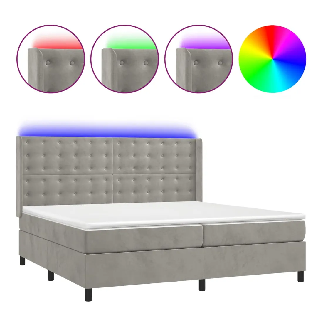 Utilisez ce sommier tapissier avec matelas et LED pour profiter d'un sommeil réparateur ! C'est le point central de votre chambre à coucher. Velours doux : le velours est un tissu doux et luxueux qui se reconnaît à son tas dense de fibres uniformément coupées qui ont une touche lisse. Le tissu en velours présente un toucher doux distinctif, ce qui le rend confortable au toucher.Tête de lit pratique : la tête de lit est réglable en hauteur selon vos préférences. La tête de lit vous offre un excellent soutien du dos lorsque vous êtes assis dans votre lit pour lire ou regarder la télévision.Bande LED colorée : apportez de l'éclairage dans l'obscurité avec des lumières LED colorées !Matelas à ressorts ensachés : le ressort ensaché individuel intégré est connu pour sa très haute qualité tout en assurant un haut niveau de durabilité et d'adaptabilité. Il peut absorber efficacement le bruit et les chocs causés par les sauts et les rotations.Protège-matelas doux pour la peau : le protège-matelas est recouvert d'un tissu résistant et doux pour la peau, ce qui le rend souple et confortable. Remarque :Pour des raisons d'hygiène, le matelas ne peut pas être retourné si l'emballage est retiré ou ouvert.Seule la partie avec un symbole de ciseaux peut être coupée et seule la partie avec l'USB continuera à fonctionner comme avant.Chaque produit est livré avec un manuel de montage dans la boîte pour un montage facile.Ce produit est doté d'un connecteur USB, mais la source d'alimentation certifiée de USB 5V n'est pas incluse.