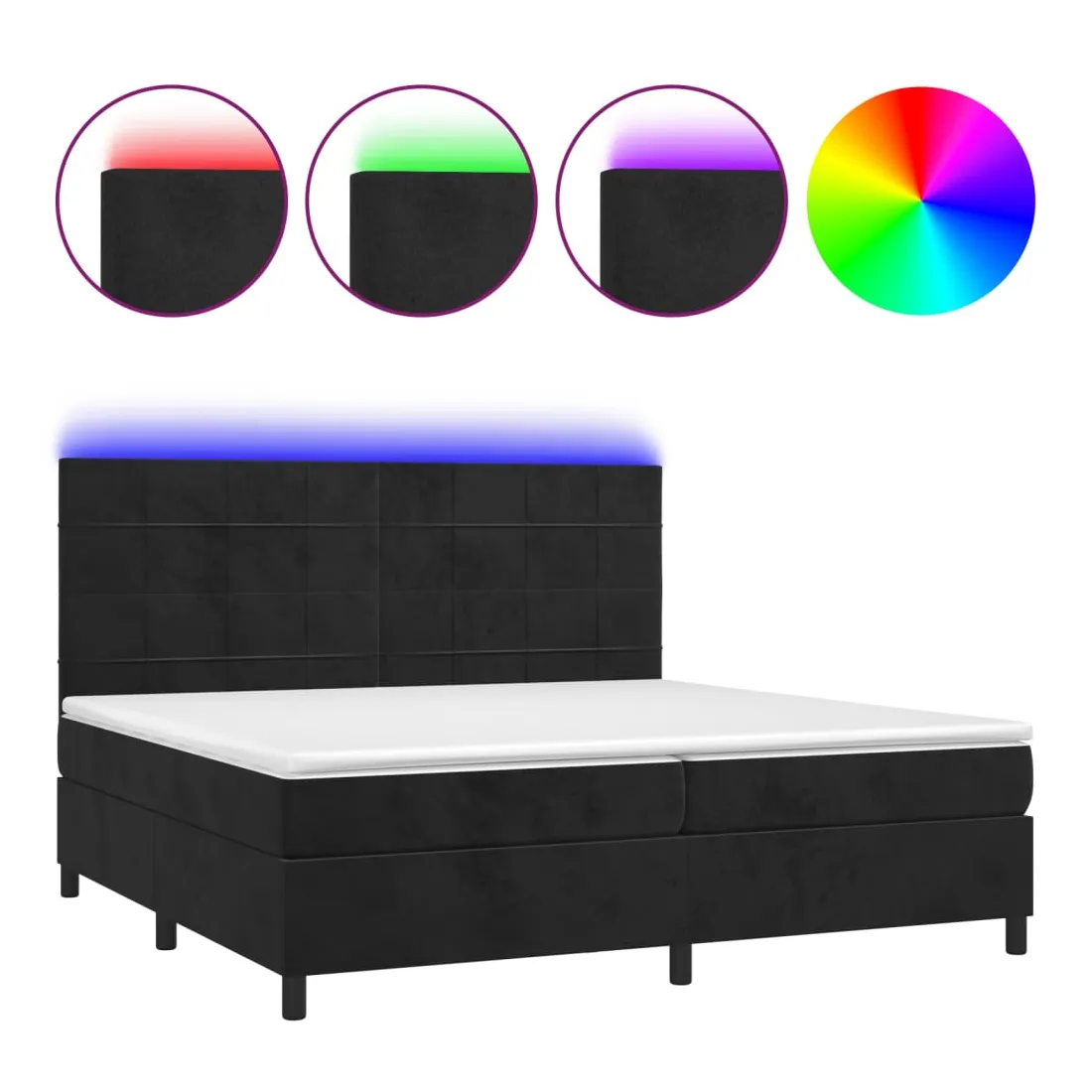 Utilisez ce sommier tapissier avec matelas et LED pour profiter d'un sommeil réparateur ! C'est le point central de votre chambre à coucher. Velours doux : le velours est un tissu doux et luxueux qui se reconnaît à son tas dense de fibres uniformément coupées qui ont une touche lisse. Le tissu en velours présente un toucher doux distinctif, ce qui le rend confortable au toucher.Tête de lit pratique : la tête de lit est réglable en hauteur selon vos préférences. La tête de lit vous offre un excellent soutien du dos lorsque vous êtes assis dans votre lit pour lire ou regarder la télévision.Bande LED colorée : apportez de l'éclairage dans l'obscurité avec des lumières LED colorées !Matelas à ressorts ensachés : le ressort ensaché individuel intégré est connu pour sa très haute qualité tout en assurant un haut niveau de durabilité et d'adaptabilité. Il peut absorber efficacement le bruit et les chocs causés par les sauts et les rotations.Protège-matelas doux pour la peau : le protège-matelas est recouvert d'un tissu résistant et doux pour la peau, ce qui le rend souple et confortable. Remarque :Pour des raisons d'hygiène, le matelas ne peut pas être retourné si l'emballage est retiré ou ouvert.Seule la partie avec un symbole de ciseaux peut être coupée et seule la partie avec l'USB continuera à fonctionner comme avant.Chaque produit est livré avec un manuel de montage dans la boîte pour un montage facile.Ce produit est doté d'un connecteur USB, mais la source d'alimentation certifiée de USB 5V n'est pas incluse.