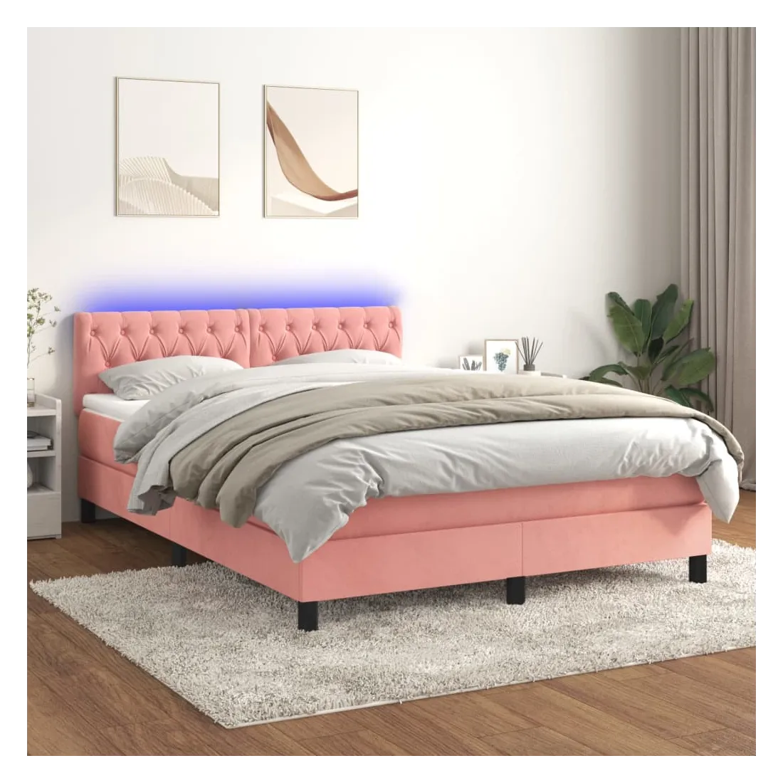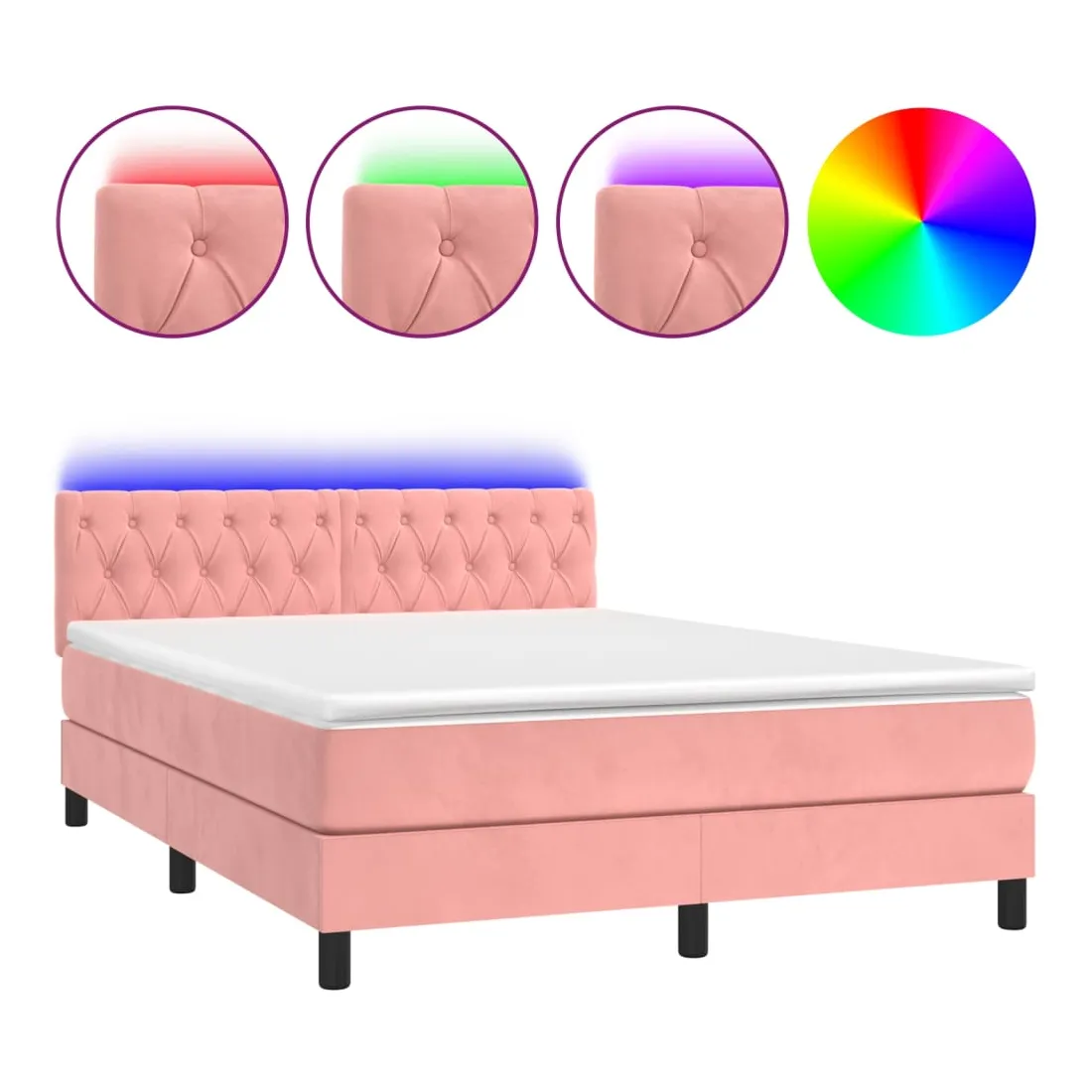 Utilisez ce sommier tapissier avec matelas et LED pour profiter d'un sommeil réparateur ! C'est le point central de votre chambre à coucher. Velours doux : le velours est un tissu doux et luxueux qui se reconnaît à son tas dense de fibres uniformément coupées qui ont une touche lisse. Le tissu en velours présente un toucher doux distinctif, ce qui le rend confortable au toucher.Tête de lit pratique : la tête de lit est réglable en hauteur selon vos préférences. La tête de lit vous offre un excellent soutien du dos lorsque vous êtes assis dans votre lit pour lire ou regarder la télévision.Bande LED colorée : apportez de l'éclairage dans l'obscurité avec des lumières LED colorées !Matelas à ressorts ensachés : le ressort ensaché individuel intégré est connu pour sa très haute qualité tout en assurant un haut niveau de durabilité et d'adaptabilité. Il peut absorber efficacement le bruit et les chocs causés par les sauts et les rotations.Protège-matelas doux pour la peau : le protège-matelas est recouvert d'un tissu résistant et doux pour la peau, ce qui le rend souple et confortable. Remarque :Pour des raisons d'hygiène, le matelas ne peut pas être retourné si l'emballage est retiré ou ouvert.Chaque produit est livré avec un manuel de montage dans la boîte pour un montage facile.Seule la partie avec un symbole de ciseaux peut être coupée et seule la partie avec l'USB continuera à fonctionner comme avant.Ce produit est doté d'un connecteur USB, mais la source d'alimentation certifiée de USB 5V n'est pas incluse.