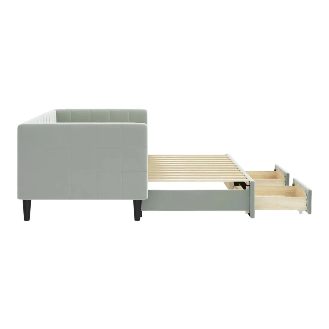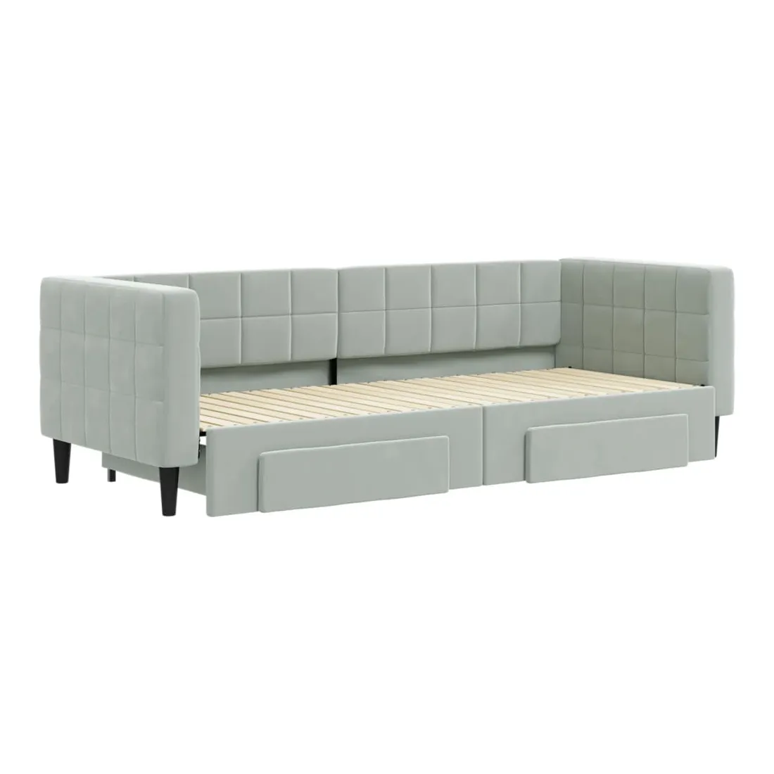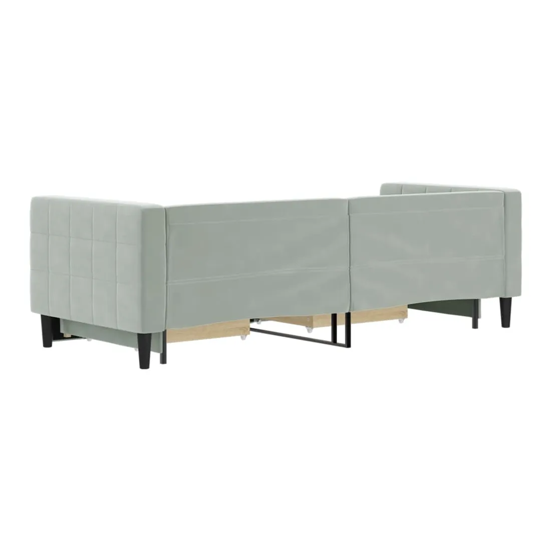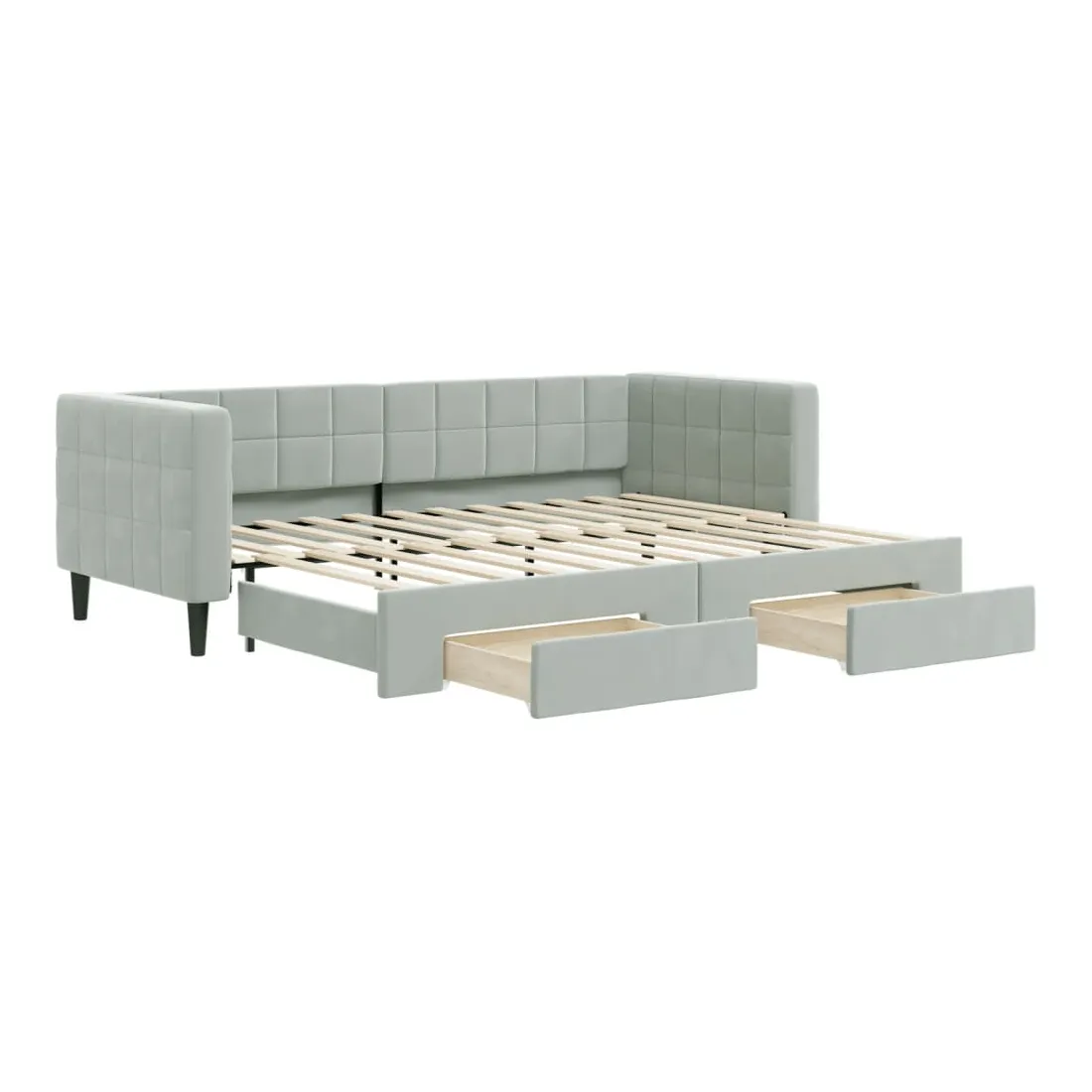 Ce lit de repos 2 en 1 avec lit gigogne, servant à la fois de canapé et de lit, constitue un supplément pratique et accrocheur à votre salon ou chambre à coucher. Lit de repos polyvalent : le canapé-lit fonctionne comme un canapé pendant la journée et se transforme facilement en lit double la nuit en retirant le lit gigogne, offrant une solution pratique pour accueillir des invités et maximiser l'espace.Grand espace de rangement : ce lit d'appoint dispose de deux tiroirs à roulettes qui offrent suffisamment d'espace pour ranger vos vêtements, chaussettes, jouets, coussins, etc.Velours doux et construction solide : ce canapé-lit a un cadre robuste en bois et en métal et est recouvert de velours doux et confortable.Design moderne : le canapé-lit a un design moderne qui présente des lignes épurées, un aspect minimaliste, ainsi que de la lumière naturelle, et ajoutera un style moderne à votre intérieur ! Bon à savoir :Les matelas ne sont pas inclus avec ce lit. Nous proposons une sélection variée de matelas. Vous pouvez consulter notre boutique pour trouver les matelas assortis.