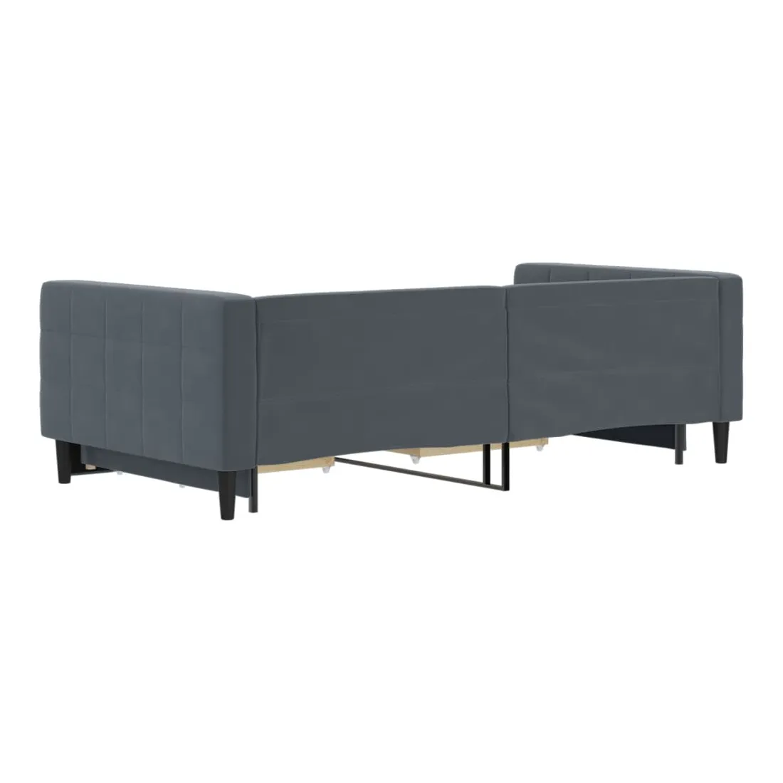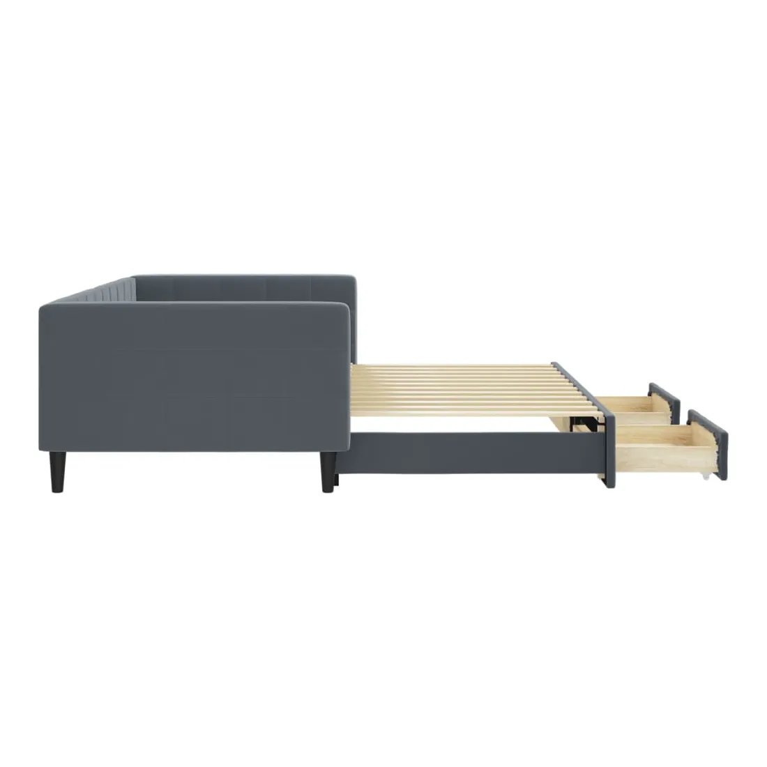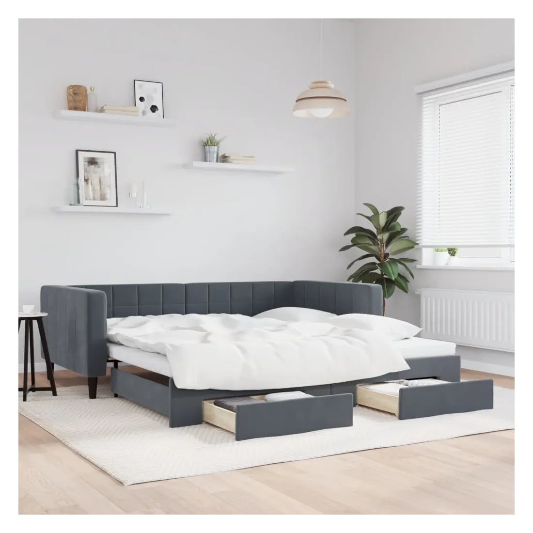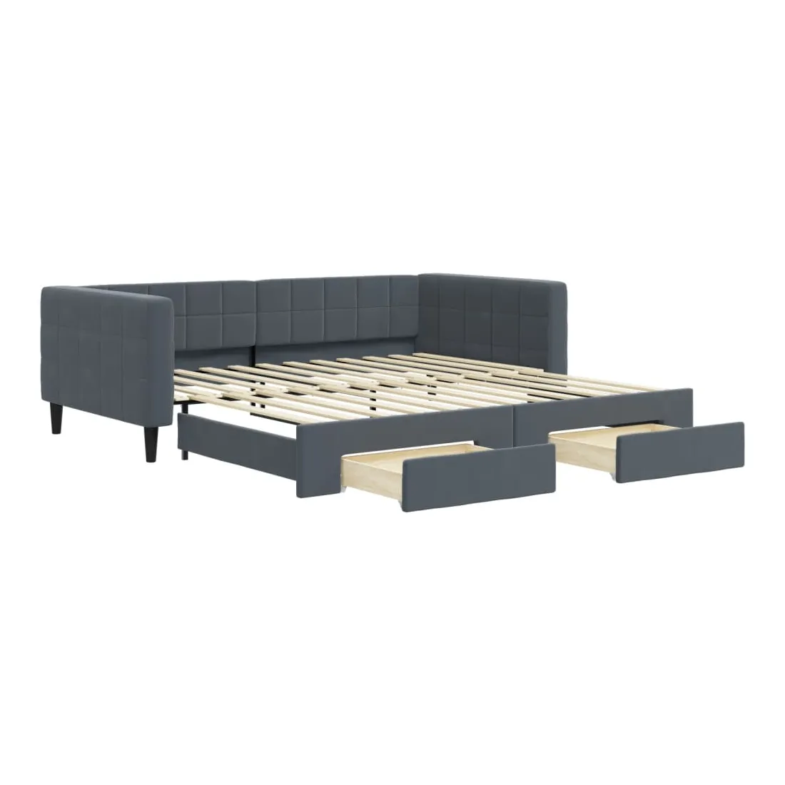Ce lit de repos 2 en 1 avec lit gigogne, servant à la fois de canapé et de lit, constitue un supplément pratique et accrocheur à votre salon ou chambre à coucher. Lit de repos polyvalent : le canapé-lit fonctionne comme un canapé pendant la journée et se transforme facilement en lit double la nuit en retirant le lit gigogne, offrant une solution pratique pour accueillir des invités et maximiser l'espace.Grand espace de rangement : ce lit d'appoint dispose de deux tiroirs à roulettes qui offrent suffisamment d'espace pour ranger vos vêtements, chaussettes, jouets, coussins, etc.Velours doux et construction solide : ce canapé-lit a un cadre robuste en bois et en métal et est recouvert de velours doux et confortable.Design moderne : le canapé-lit a un design moderne qui présente des lignes épurées, un aspect minimaliste, ainsi que de la lumière naturelle, et ajoutera un style moderne à votre intérieur ! Bon à savoir :Les matelas ne sont pas inclus avec ce lit. Nous proposons une sélection variée de matelas. Vous pouvez consulter notre boutique pour trouver les matelas assortis.
