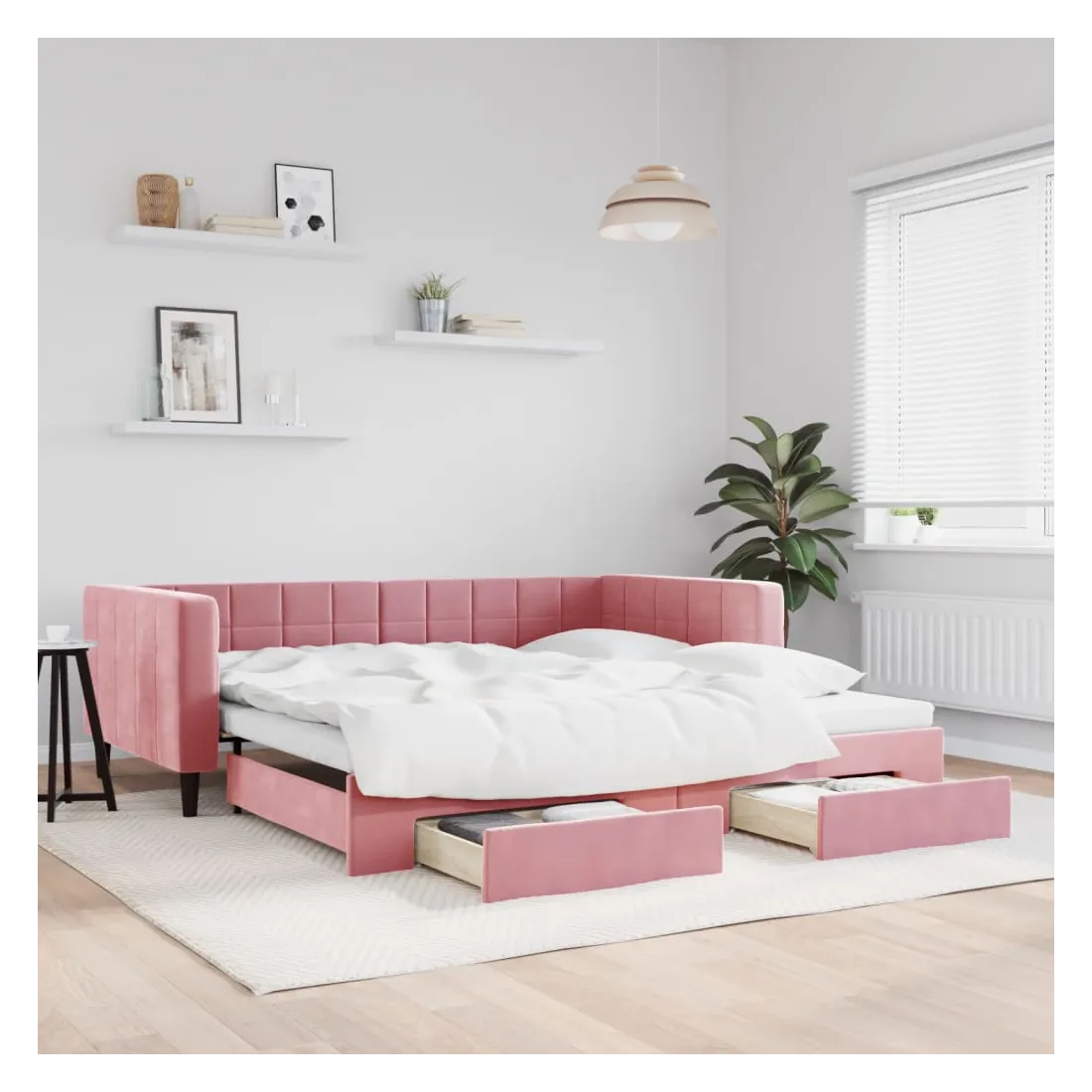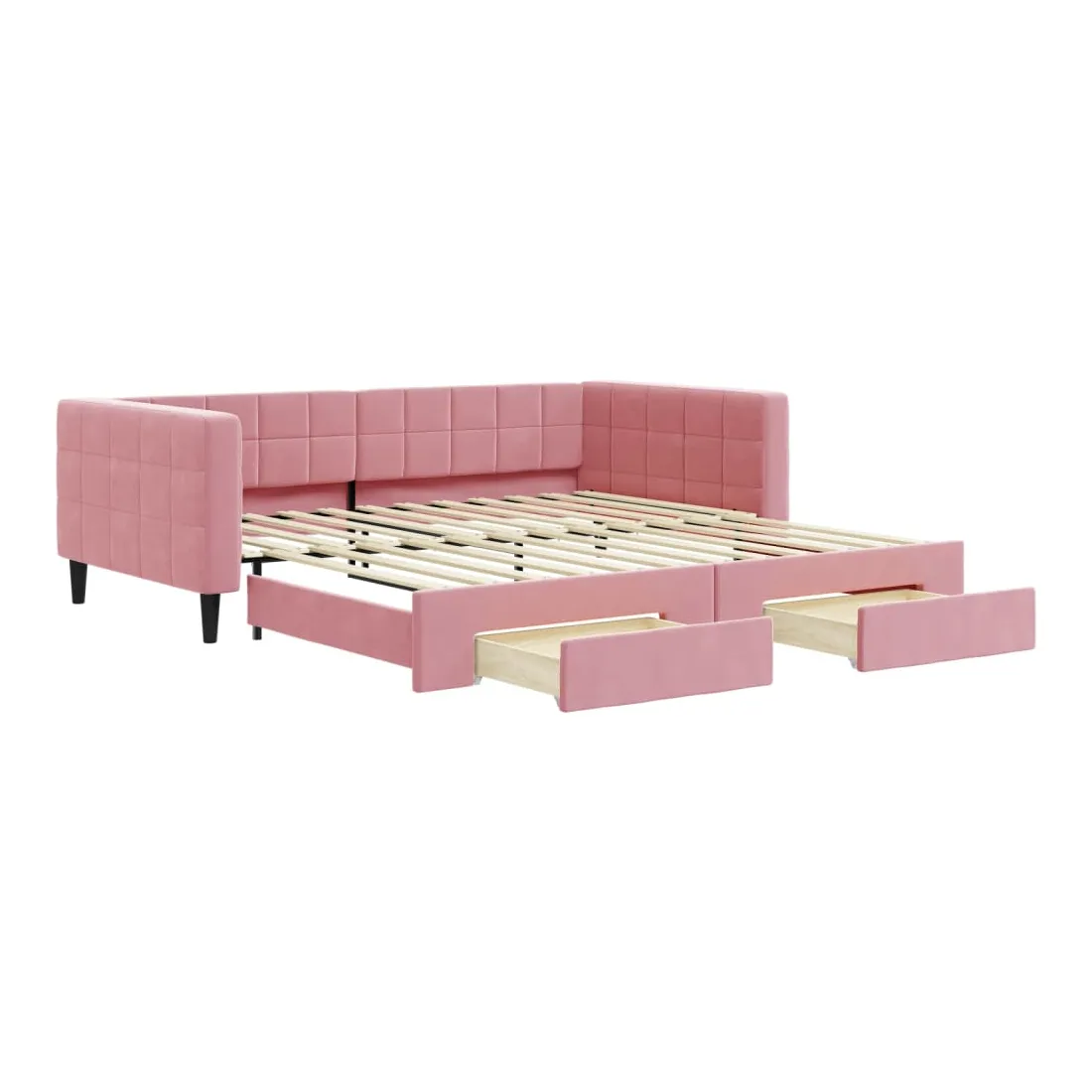 Ce lit de repos 2 en 1 avec lit gigogne, servant à la fois de canapé et de lit, constitue un supplément pratique et accrocheur à votre salon ou chambre à coucher. Lit de repos polyvalent : le canapé-lit fonctionne comme un canapé pendant la journée et se transforme facilement en lit double la nuit en retirant le lit gigogne, offrant une solution pratique pour accueillir des invités et maximiser l'espace.Grand espace de rangement : ce lit d'appoint dispose de deux tiroirs à roulettes qui offrent suffisamment d'espace pour ranger vos vêtements, chaussettes, jouets, coussins, etc.Velours doux et construction solide : ce canapé-lit a un cadre robuste en bois et en métal et est recouvert de velours doux et confortable.Design moderne : le canapé-lit a un design moderne qui présente des lignes épurées, un aspect minimaliste, ainsi que de la lumière naturelle, et ajoutera un style moderne à votre intérieur ! Bon à savoir :Les matelas ne sont pas inclus avec ce lit. Nous proposons une sélection variée de matelas. Vous pouvez consulter notre boutique pour trouver les matelas assortis.