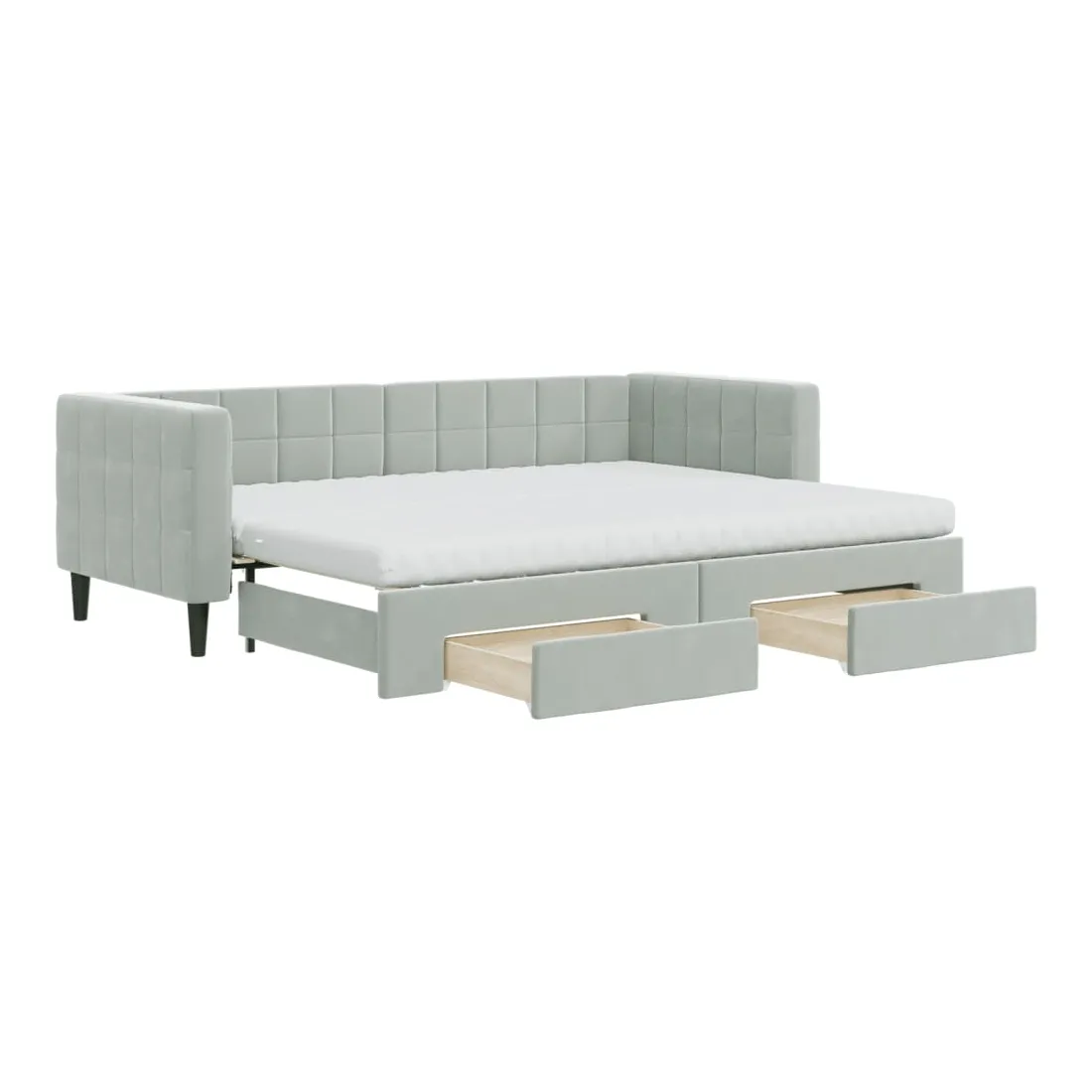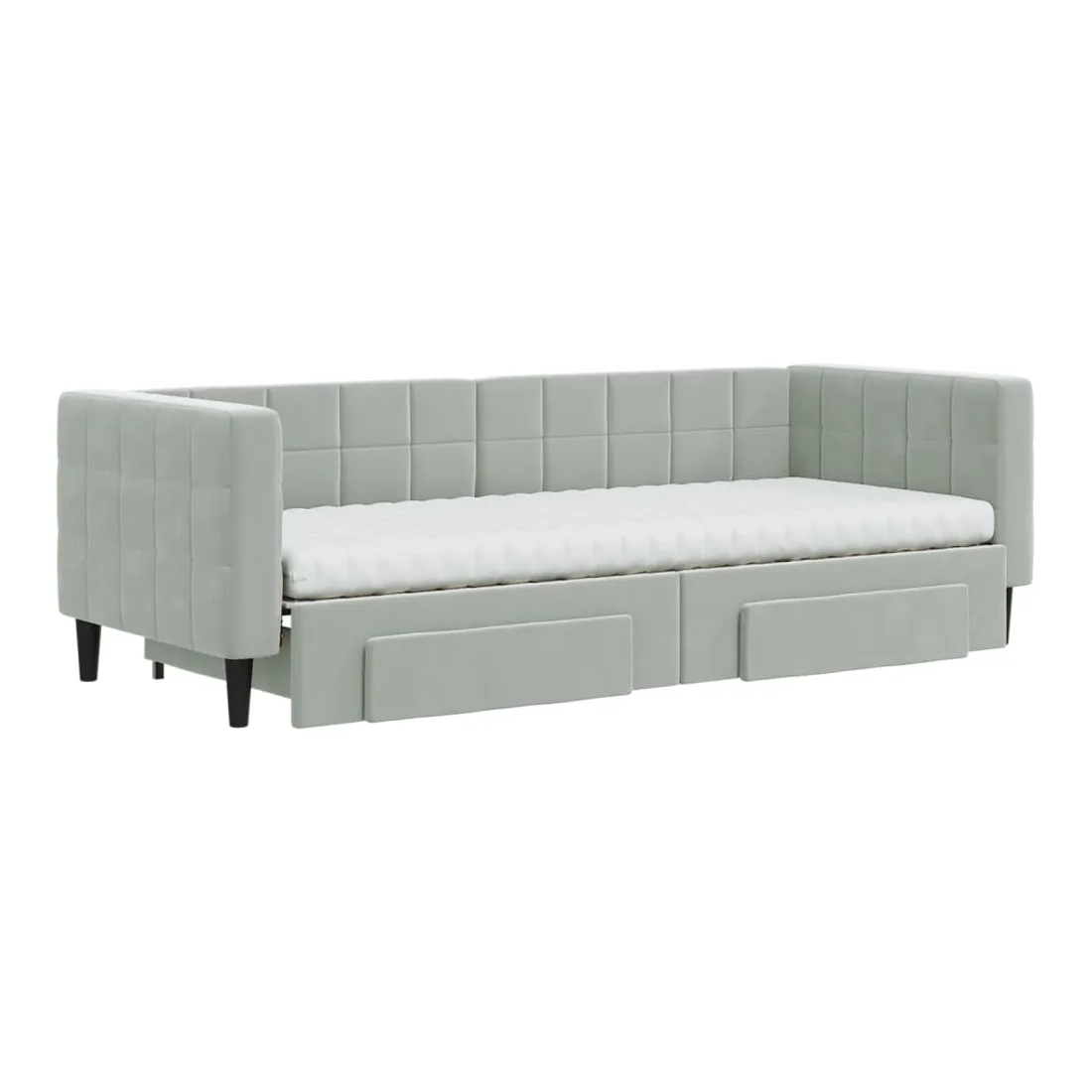 Ce lit de repos 2 en 1 avec lit gigogne, servant à la fois de canapé et de lit, constitue un supplément pratique et accrocheur à votre salon ou chambre à coucher. Lit de repos polyvalent : le canapé-lit fonctionne comme un canapé pendant la journée et se transforme facilement en lit double la nuit en retirant le lit gigogne, offrant une solution pratique pour accueillir des invités et maximiser l'espace.Grand espace de rangement : ce lit d'appoint dispose de deux tiroirs à roulettes qui offrent suffisamment d'espace pour ranger vos vêtements, chaussettes, jouets, coussins, etc.Matelas en mousse confortable : ce lit est fourni avec deux matelas en mousse pour un soutien maximal et un confort optimal.Velours doux et construction solide : ce canapé-lit a un cadre robuste en bois et en métal et est recouvert de velours doux et confortable.