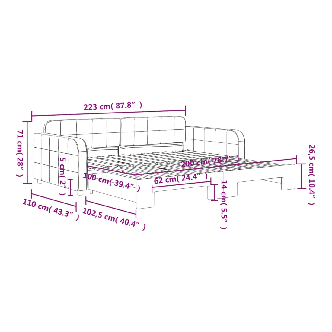 - Dimensions (non étendu) : 223 x 110 x 71 cm (L x l x H)