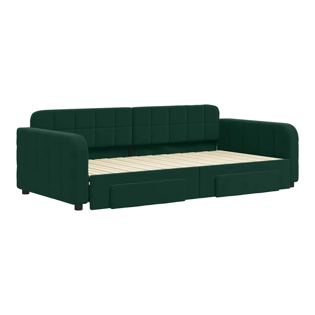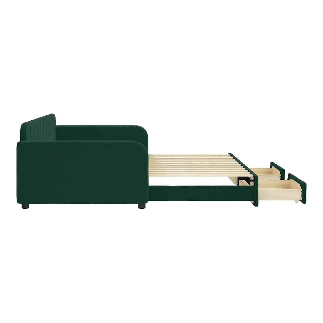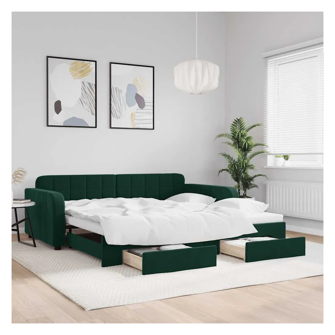 Ce lit de repos 2 en 1 avec lit gigogne, servant à la fois de canapé et de lit, constitue un supplément pratique et accrocheur à votre salon ou chambre à coucher. Lit de repos polyvalent : le canapé-lit fonctionne comme un canapé pendant la journée et se transforme facilement en lit double la nuit en retirant le lit gigogne, offrant une solution pratique pour accueillir des invités et maximiser l'espace. Grand espace de rangement : ce lit d'appoint dispose de deux tiroirs à roulettes qui offrent suffisamment d'espace pour ranger vos vêtements, chaussettes, jouets, coussins, etc.Velours doux et construction solide : ce canapé-lit a un cadre robuste en bois et en métal et est recouvert de velours doux et confortable. Bon à savoir :Les matelas ne sont pas inclus avec ce lit. Nous proposons une sélection variée de matelas. Vous pouvez consulter notre boutique pour trouver les matelas assortis.