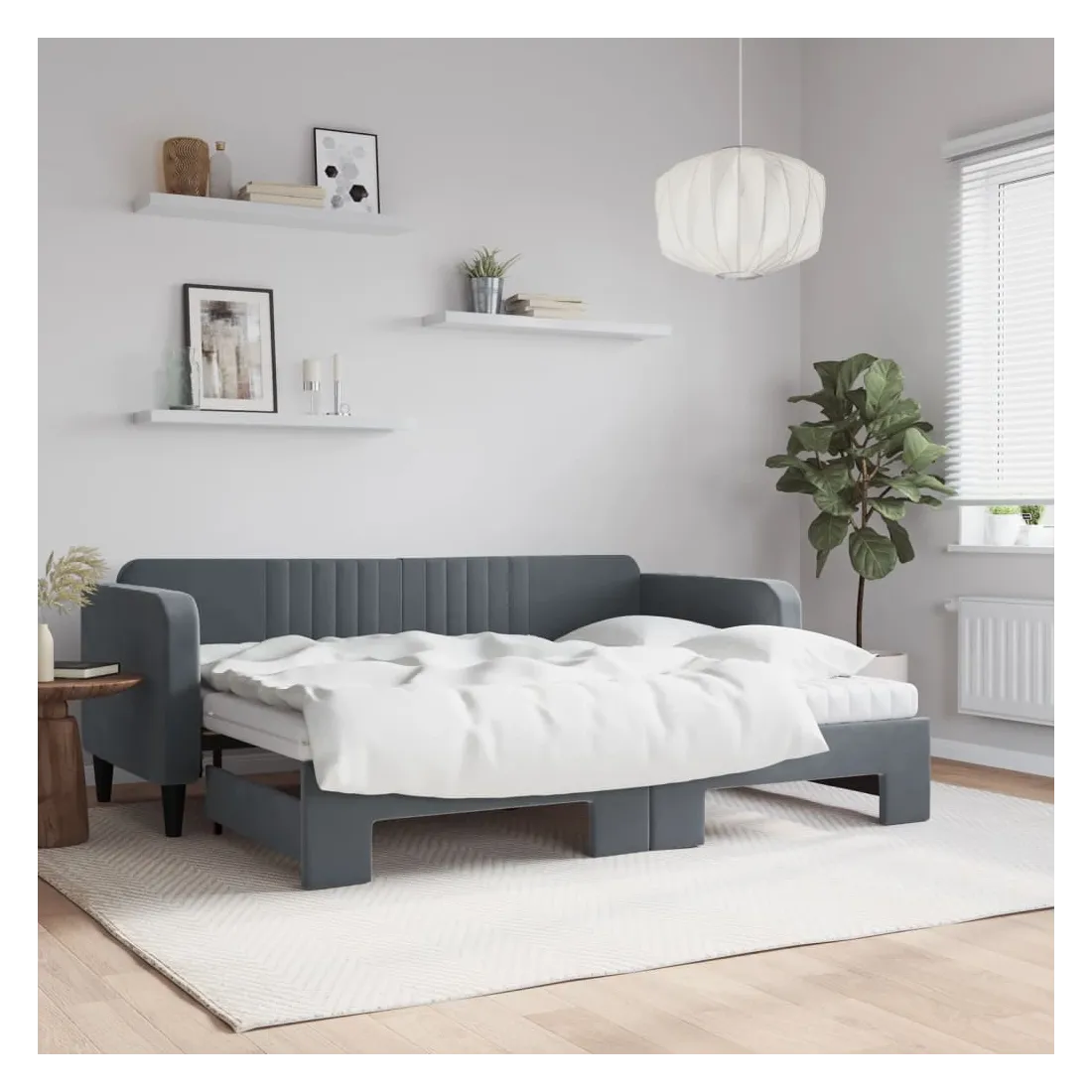 Ce lit de repos 2 en 1 avec lit gigogne, servant à la fois de canapé et de lit, constitue un supplément pratique et accrocheur à votre salon ou chambre à coucher. Lit de repos polyvalent : le canapé-lit fonctionne comme un canapé pendant la journée et se transforme facilement en lit double la nuit en retirant le lit gigogne, offrant une solution pratique pour accueillir des invités et maximiser l'espace.Matelas en mousse confortable : ce lit est fourni avec deux matelas en mousse pour un soutien maximal et un confort optimal.Velours doux et construction solide : ce canapé-lit a un cadre robuste en bois et en métal et est recouvert de velours doux et confortable.Design moderne : le canapé-lit a un design moderne qui présente des lignes épurées, un aspect minimaliste, ainsi que de la lumière naturelle, et ajoutera un style moderne à votre intérieur !