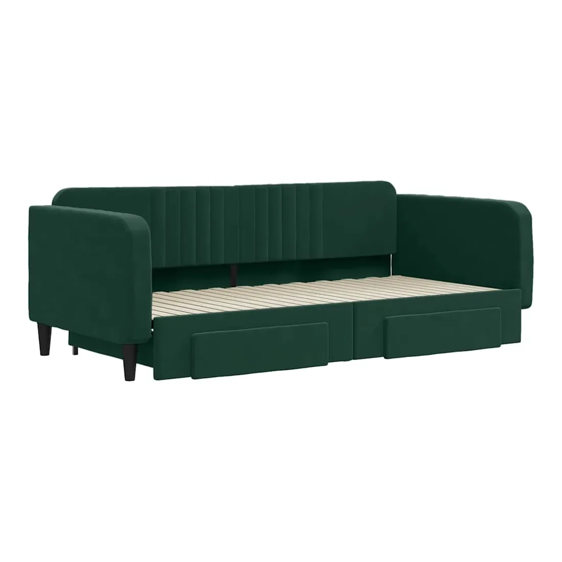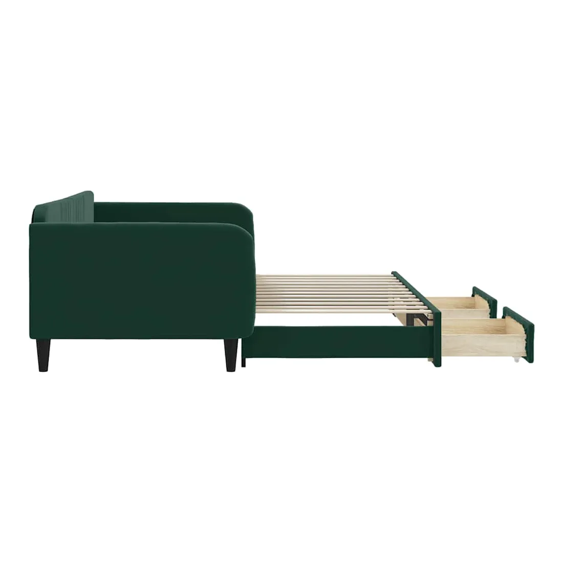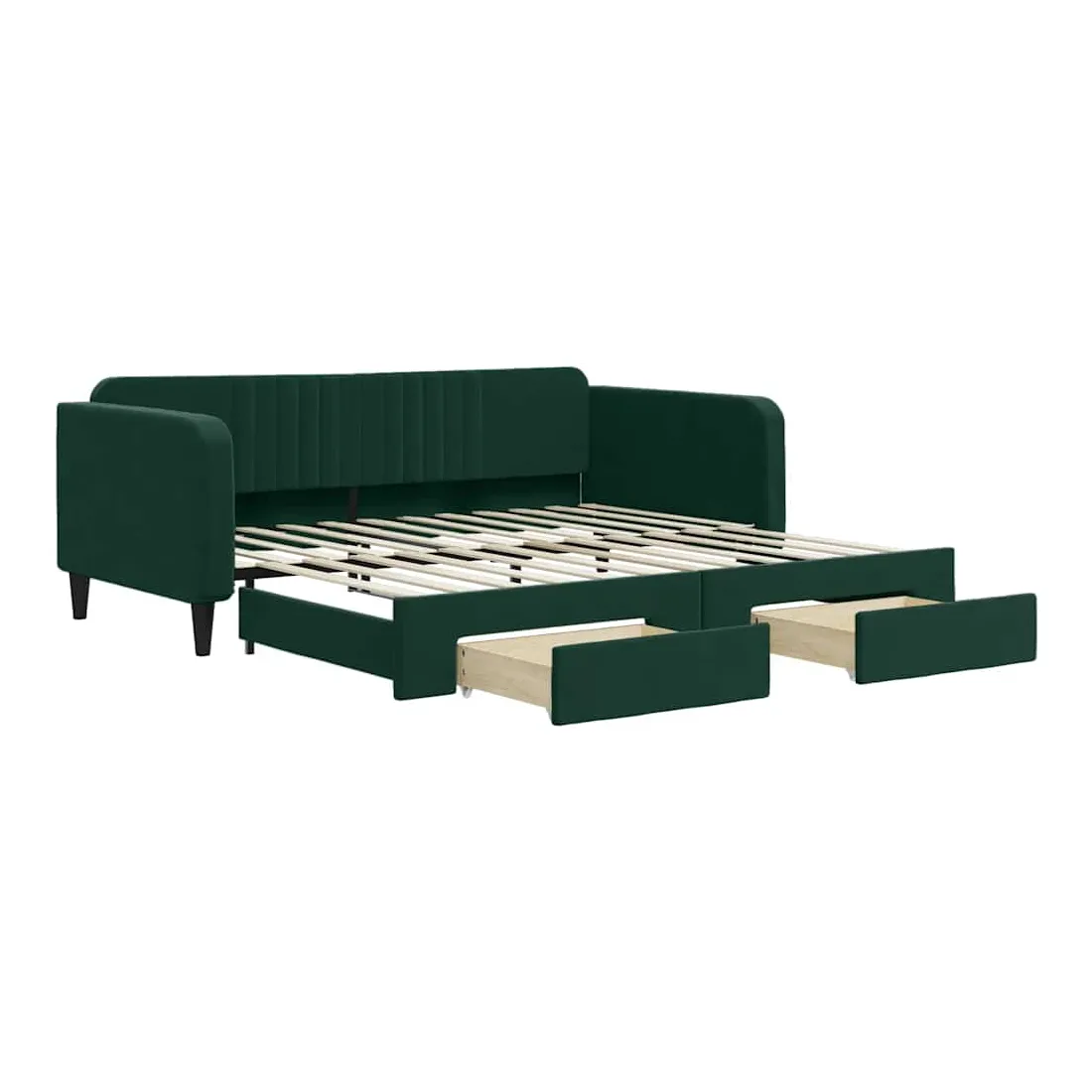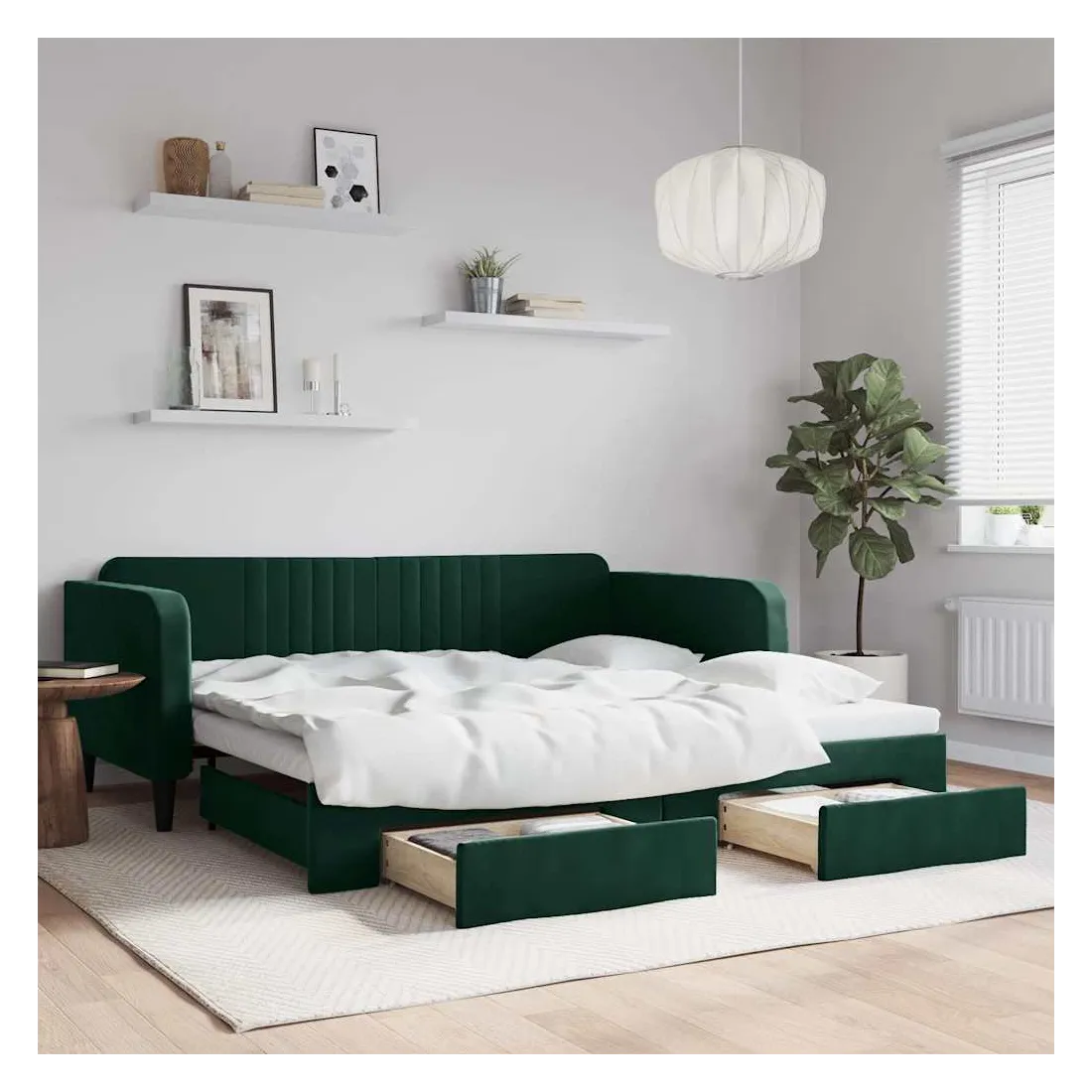 Ce lit de repos 2 en 1 avec lit gigogne, servant à la fois de canapé et de lit, constitue un supplément pratique et accrocheur à votre salon ou chambre à coucher. Lit de repos polyvalent : le canapé-lit fonctionne comme un canapé pendant la journée et se transforme facilement en lit double la nuit en retirant le lit gigogne, offrant une solution pratique pour accueillir des invités et maximiser l'espace.Grand espace de rangement : ce lit d'appoint dispose de deux tiroirs à roulettes qui offrent suffisamment d'espace pour ranger vos vêtements, chaussettes, jouets, coussins, etc.Velours doux et construction solide : ce canapé-lit a un cadre robuste en bois et en métal et est recouvert de velours doux et confortable.Design moderne : le canapé-lit a un design moderne qui présente des lignes épurées, un aspect minimaliste, ainsi que de la lumière naturelle, et ajoutera un style moderne à votre intérieur ! Bon à savoir :Les matelas ne sont pas inclus avec ce lit. Nous proposons une sélection variée de matelas. Vous pouvez consulter notre boutique pour trouver les matelas assortis.