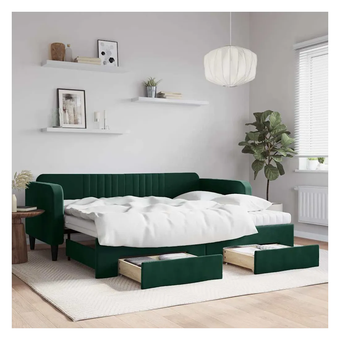 Ce lit de repos 2 en 1 avec lit gigogne, servant à la fois de canapé et de lit, constitue un supplément pratique et accrocheur à votre salon ou chambre à coucher. Lit de repos polyvalent : le canapé-lit fonctionne comme un canapé pendant la journée et se transforme facilement en lit double la nuit en retirant le lit gigogne, offrant une solution pratique pour accueillir des invités et maximiser l'espace.Grand espace de rangement : ce lit d'appoint dispose de deux tiroirs à roulettes qui offrent suffisamment d'espace pour ranger vos vêtements, chaussettes, jouets, coussins, etc.Matelas en mousse confortable : ce lit est fourni avec deux matelas en mousse pour un soutien maximal et un confort optimal.Velours doux et construction solide : ce canapé-lit a un cadre robuste en bois et en métal et est recouvert de velours doux et confortable.