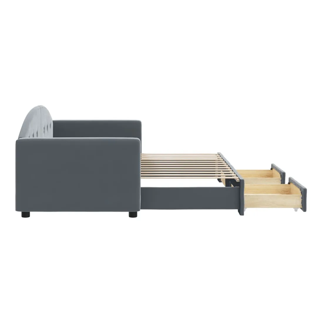 Ce lit de repos 2 en 1 avec lit gigogne et tiroirs, servant à la fois de canapé et de lit, constitue un ajout pratique et accrocheur à votre salon ou chambre à coucher. Lit de repos polyvalent : le canapé-lit fonctionne comme un canapé pendant la journée et se transforme facilement en lit double la nuit en retirant le lit gigogne, offrant une solution pratique pour accueillir des invités et maximiser l'espace.Grand espace de rangement : ce lit d'appoint dispose de deux tiroirs à roulettes qui offrent suffisamment d'espace pour ranger vos vêtements, chaussettes, jouets, coussins, etc.Velours doux et construction solide : ce canapé-lit a un cadre robuste en bois et en métal et est recouvert de velours doux et confortable. Bon à savoir :Les matelas ne sont pas inclus avec ce lit. Nous proposons une sélection variée de matelas. Vous pouvez consulter notre boutique pour trouver les matelas assortis.