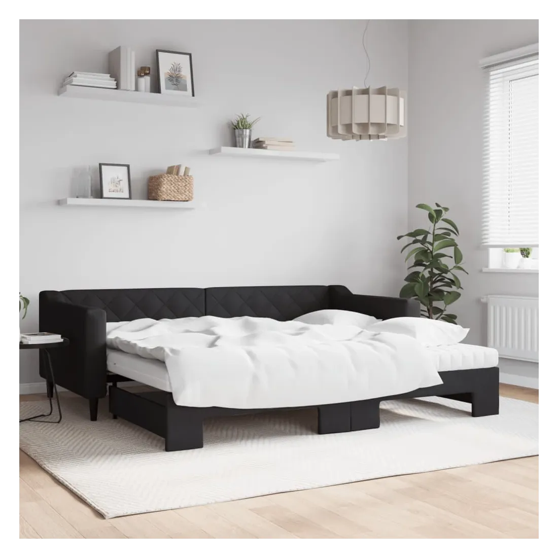 Ce lit de repos 2 en 1 avec lit gigogne, servant à la fois de canapé et de lit, constitue un supplément pratique et accrocheur à votre salon ou chambre à coucher. Lit de repos polyvalent : le canapé-lit fonctionne comme un canapé pendant la journée et se transforme facilement en lit double la nuit en retirant le lit gigogne, offrant une solution pratique pour accueillir des invités et maximiser l'espace.Matelas en mousse confortable : ce lit est fourni avec deux matelas en mousse pour un soutien maximal et un confort optimal.Tissu durable et construction solide : ce canapé-lit a une structure robuste en bois et en métal et est recouvert d'un tissu durable et confortable.Design moderne : le canapé-lit a un design moderne qui présente des lignes épurées, un aspect minimaliste, et ajoutera un style moderne à votre intérieur !