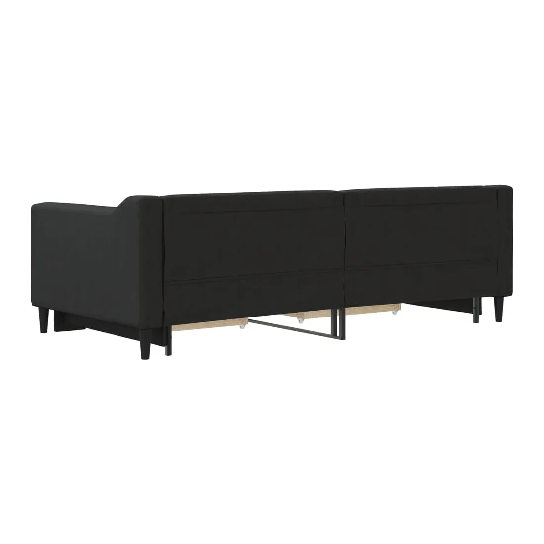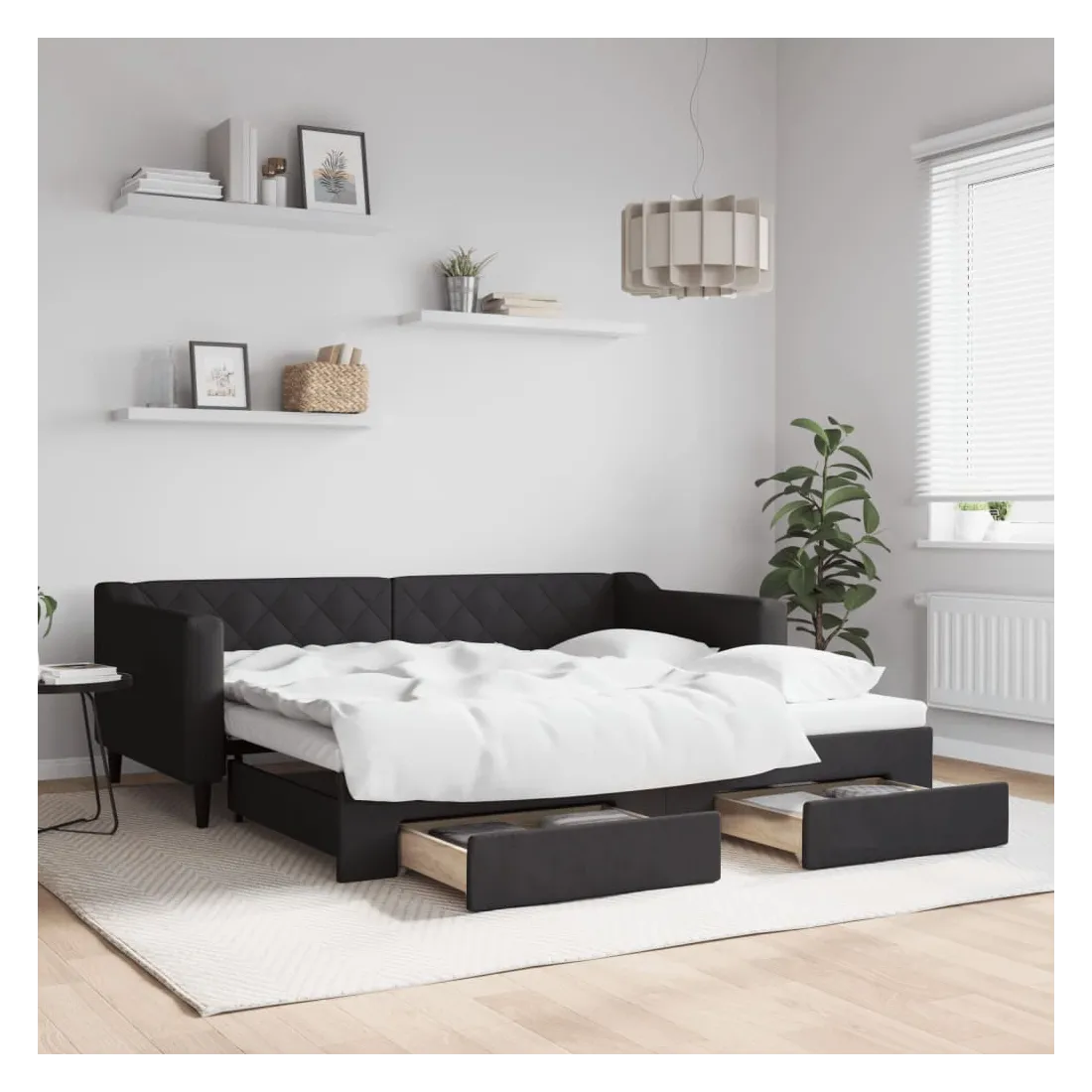 Ce lit de repos 2 en 1 avec lit gigogne, servant à la fois de canapé et de lit, constitue un supplément pratique et accrocheur à votre salon ou chambre à coucher. Lit de repos polyvalent : le canapé-lit fonctionne comme un canapé pendant la journée et se transforme facilement en lit double la nuit en retirant le lit gigogne, offrant une solution pratique pour accueillir des invités et maximiser l'espace. Grand espace de rangement : ce lit d'appoint dispose de deux tiroirs à roulettes qui offrent suffisamment d'espace pour ranger vos vêtements, chaussettes, jouets, coussins, etc. Tissu durable et construction solide : ce canapé-lit a une structure robuste en bois et en métal et est recouvert d'un tissu durable et confortable.Design moderne : le canapé-lit a un design moderne qui présente des lignes épurées, un aspect minimaliste, et ajoutera un style moderne à votre intérieur ! Bon à savoir :Les matelas ne sont pas inclus avec ce lit. Nous proposons une sélection variée de matelas. Vous pouvez consulter notre boutique pour trouver les matelas assortis.