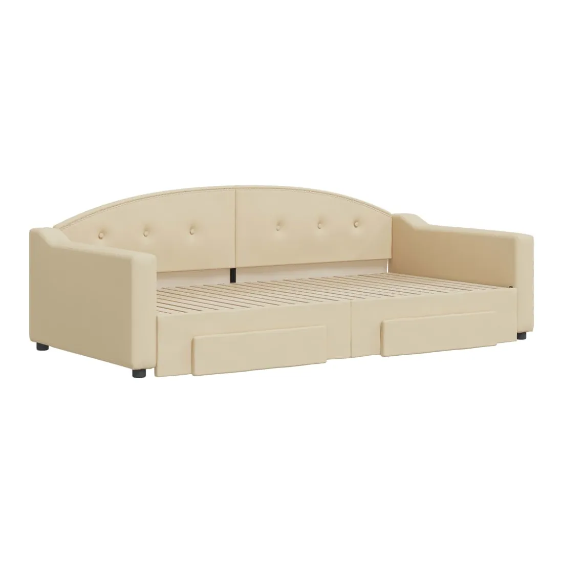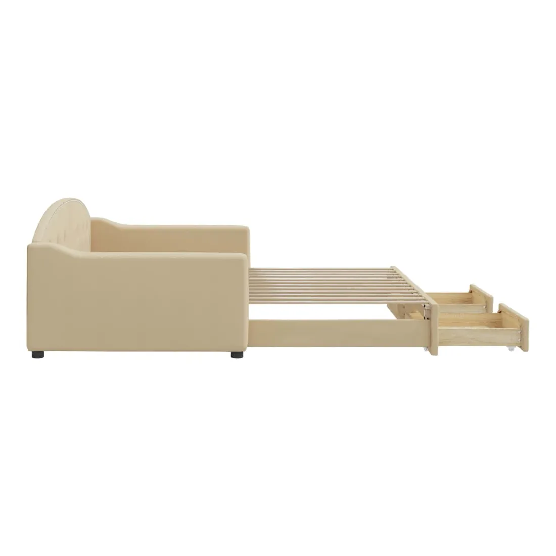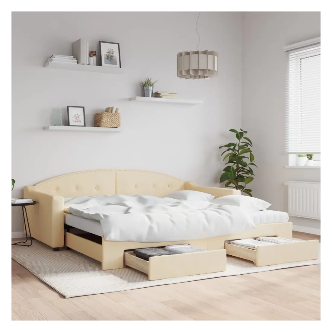Ce lit de repos 2 en 1 avec lit gigogne, servant à la fois de canapé et de lit, constitue un supplément pratique et accrocheur à votre salon ou chambre à coucher. Lit de repos polyvalent : le canapé-lit fonctionne comme un canapé pendant la journée et se transforme facilement en lit double la nuit en retirant le lit gigogne, offrant une solution pratique pour accueillir des invités et maximiser l'espace. Grand espace de rangement : ce lit d'appoint dispose de deux tiroirs à roulettes qui offrent suffisamment d'espace pour ranger vos vêtements, chaussettes, jouets, coussins, etc. Tissu durable et construction solide : ce canapé-lit a une structure robuste en bois et en métal et est recouvert d'un tissu durable et confortable. Bon à savoir :Les matelas ne sont pas inclus avec ce lit de repos. Nous proposons une sélection variée de matelas. Vous pouvez consulter notre boutique pour les matelas assortis.