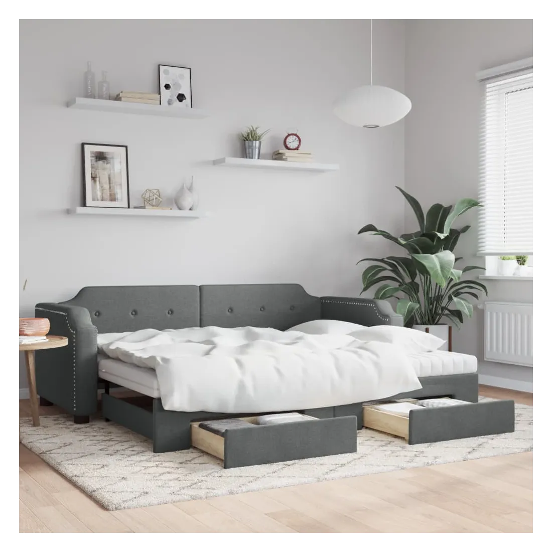 Ce lit de repos 2 en 1 avec lit gigogne, servant à la fois de canapé et de lit, constitue un supplément pratique et accrocheur à votre salon ou chambre à coucher. Lit de repos polyvalent : le canapé-lit fonctionne comme un canapé pendant la journée et se transforme facilement en lit double la nuit en retirant le lit gigogne, offrant une solution pratique pour accueillir des invités et maximiser l'espace. Grand espace de rangement : ce lit d'appoint dispose de deux tiroirs à roulettes qui offrent suffisamment d'espace pour ranger vos vêtements, chaussettes, jouets, coussins, etc. Matelas en mousse confortable : ce lit est fourni avec deux matelas en mousse pour un soutien maximal et un confort optimal. Tissu durable et construction solide : ce canapé-lit a une structure robuste en bois et en métal et est recouvert d'un tissu durable et confortable.