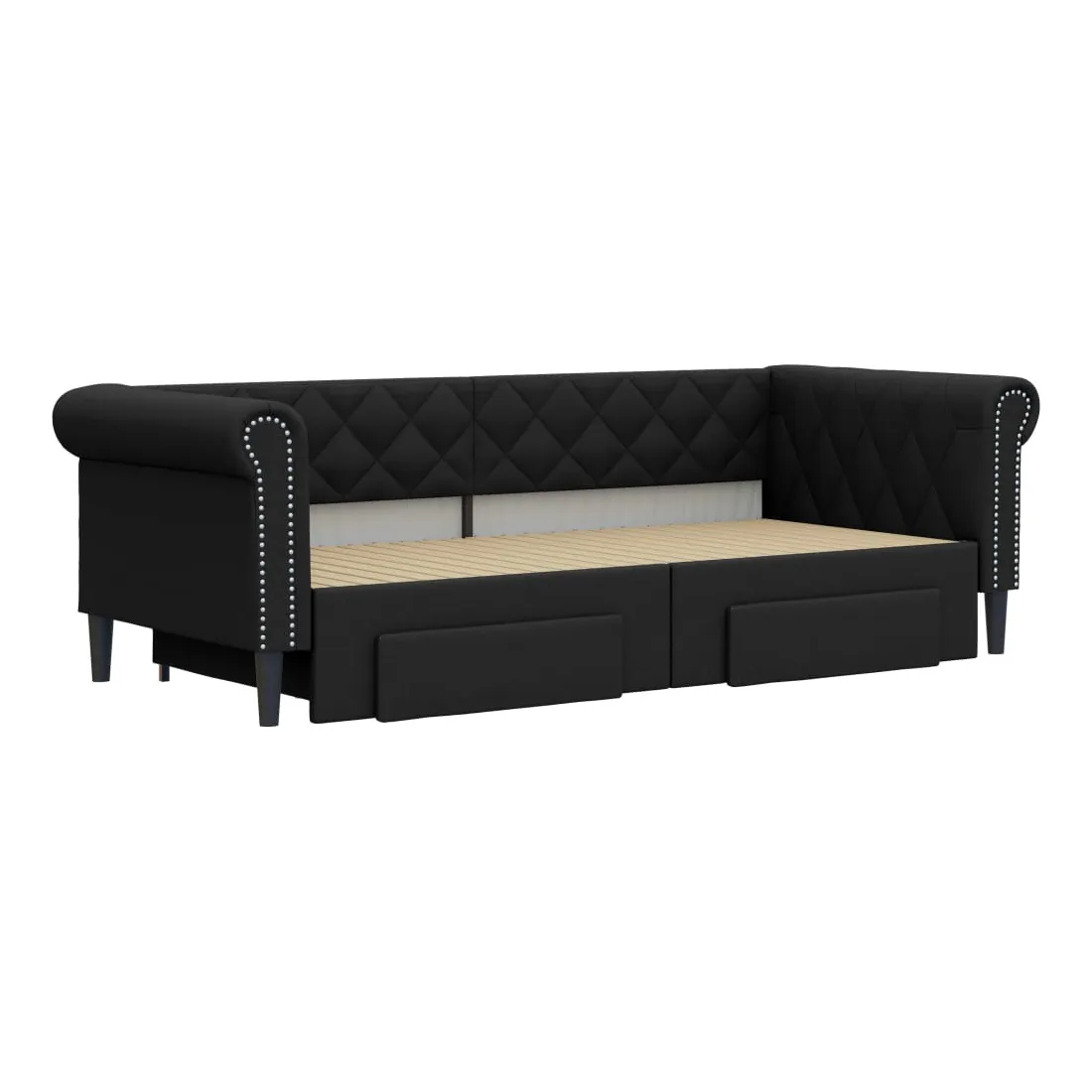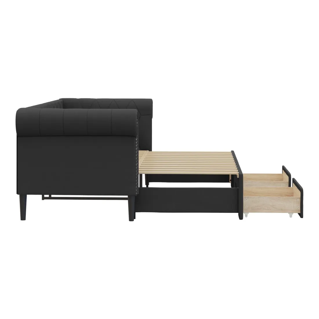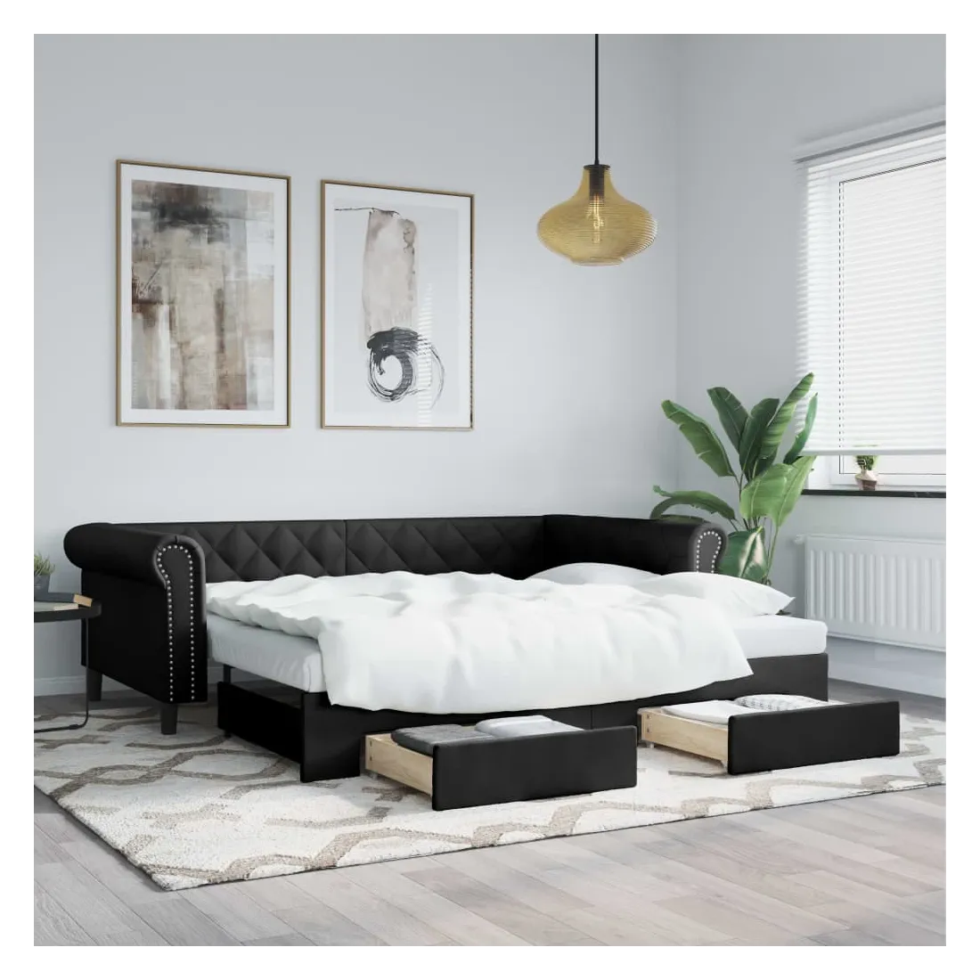 Ce lit de repos 2 en 1 avec lit gigogne, servant à la fois de canapé et de lit, constitue un supplément pratique et accrocheur à votre salon ou chambre à coucher. Lit de repos polyvalent : le canapé-lit fonctionne comme un canapé pendant la journée et se transforme facilement en lit double la nuit en retirant le lit gigogne, offrant une solution pratique pour accueillir des invités et maximiser l'espace.Grand espace de rangement : ce lit d'appoint dispose de deux tiroirs à roulettes qui offrent suffisamment d'espace pour ranger vos vêtements, chaussettes, jouets, coussins, etc.Similicuir durable et construction solide : ce canapé-lit a une structure robuste en bois et en métal et est recouvert d'un similicuir durable et facile à nettoyer.Design moderne : le canapé-lit a un design moderne qui présente des lignes épurées, un aspect minimaliste, ainsi que de la lumière naturelle, et ajoutera un style moderne à votre intérieur ! Bon à savoir :Les matelas ne sont pas inclus avec ce lit. Nous proposons une sélection variée de matelas. Vous pouvez consulter notre boutique pour trouver les matelas assortis.