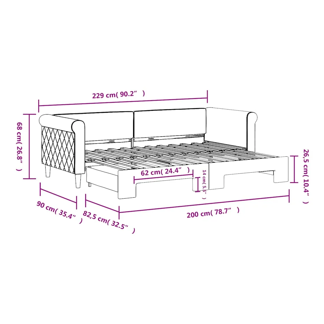 - Dimensions (non déployé) : 229 x 90 x 68 cm (L x l x H)
