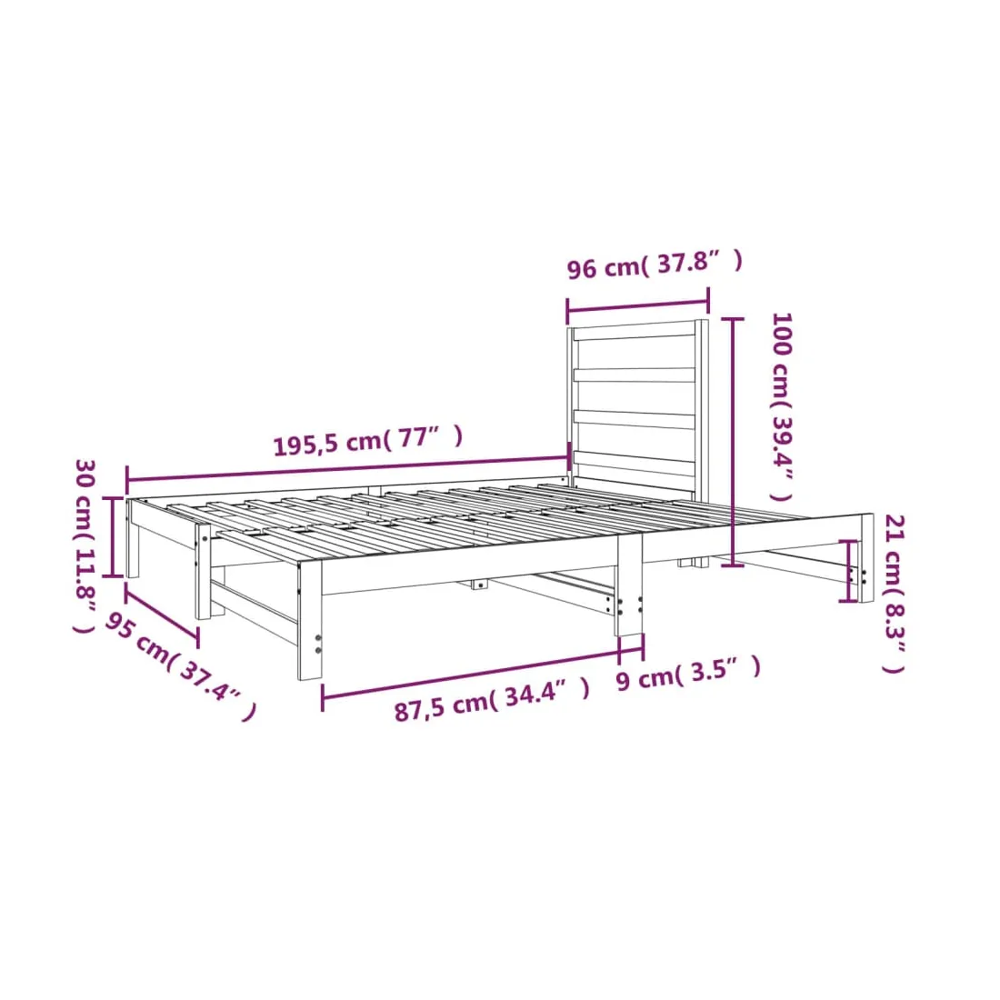 - Dimensions du lit de jour (non étendues) : 195,5 x 95 x 30 cm (L x l x H)