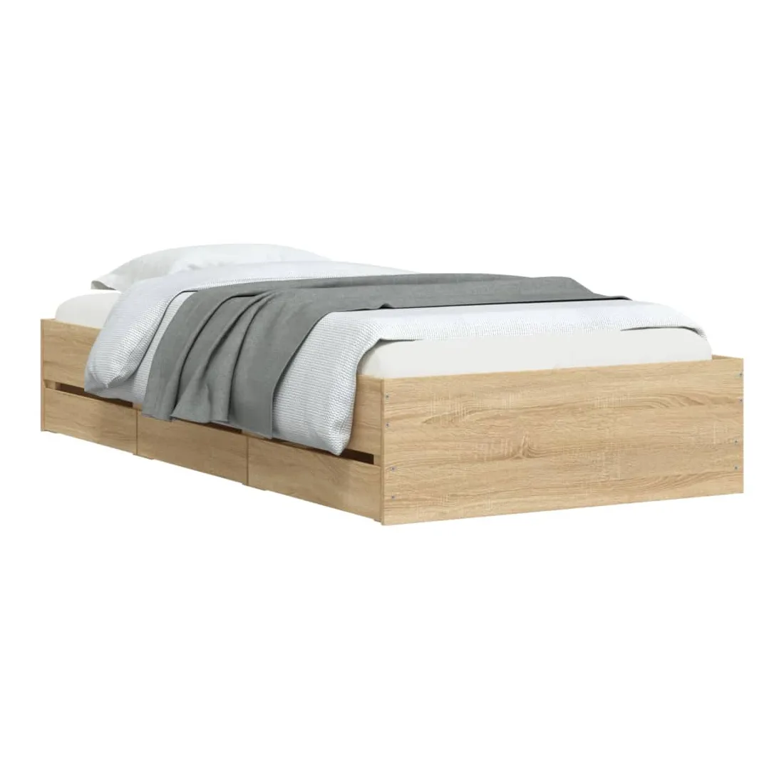 Ajoutez une touche moderne à votre chambre à coucher avec ce cadre de lit avec tiroirs ! Il apportera une touche pratique et décorative à votre espace de vie. Matériau durable : le cadre de lit est fabriquée en bois d'ingénierie. Le bois d'ingénierie est d'une qualité exceptionnelle avec une surface lisse et présente également de la résistance, de la stabilité et de la résistance à l'humidité.Lattes robustes : les lattes de contreplaqué assurent une bonne répartition du poids, garantissant que le matelas reste en place à chaque torsion de votre corps pendant le sommeil.Fonction de rangement : les tiroirs de lit inclus offrent suffisamment d'espace de rangement pour ranger vos articles essentiels, gardant votre pièce propre et bien rangée. Bon à savoir :Un matelas n'est pas inclus avec ce lit. Nous offrons une sélection variée de matelas. Vous pouvez consulter notre boutique pour trouver un matelas assorti.