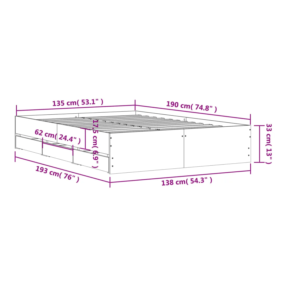 - Dimensions des tiroirs (chacun) : 62 x 30 x 15 cm (L x l x H)