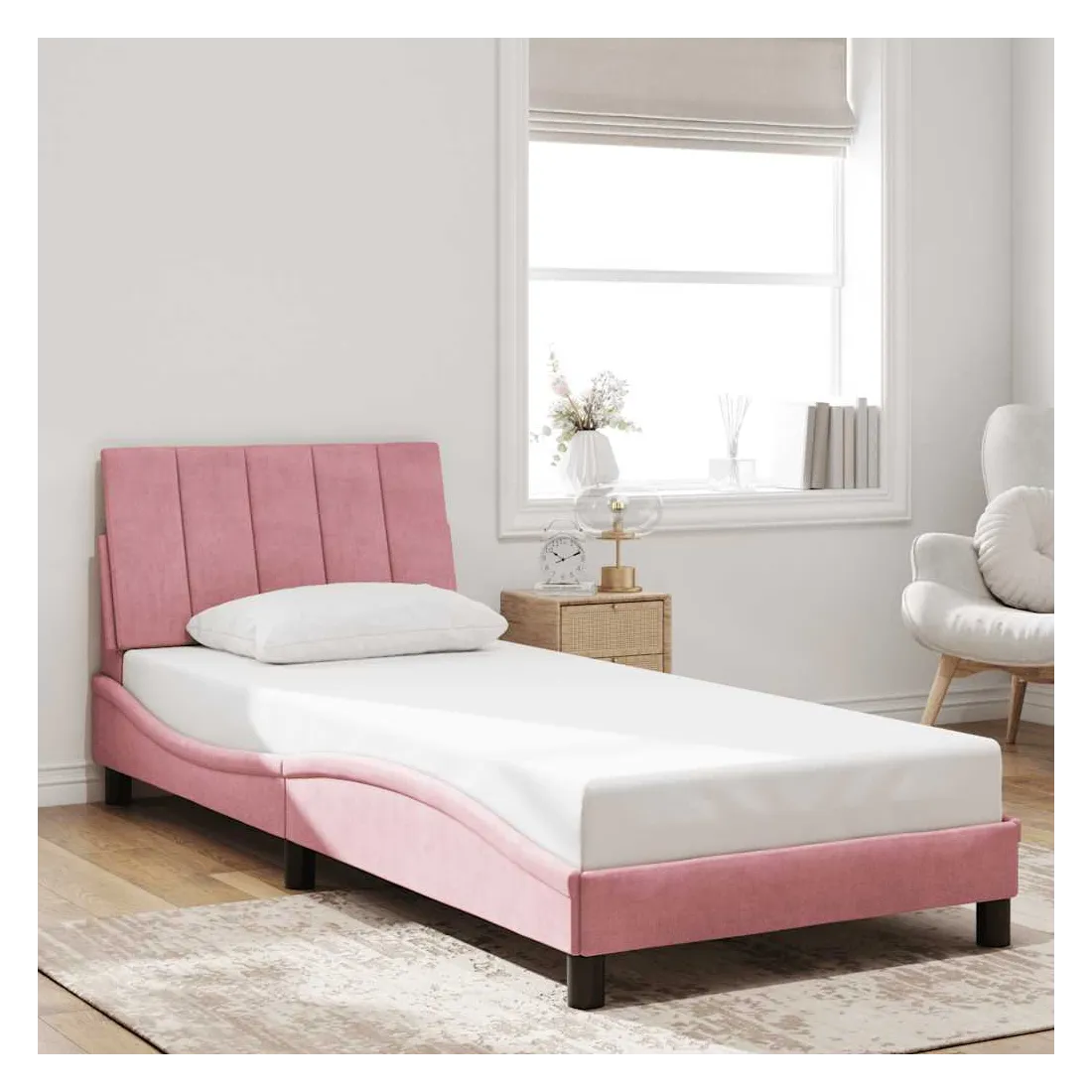 Obtenez une meilleure nuit de sommeil reposante grâce à ce cadre de lit avec tête de lit ! Il est un supplément accueillant à toute chambre à coucher. Velours doux : le velours est un tissu doux et confortable, agréable au toucher.Lattes de contreplaqué : les lattes de contreplaqué assurent une bonne répartition du poids, garantissant que le matelas reste en place à chaque torsion de votre corps pendant le sommeil.Excellent soutien : l'oreiller de tête de lit est rembourré avec de la mousse pour un confort ultra doux et optimal vous offre un excellent soutien du dos lorsque vous êtes assis dans votre lit pour lire ou regarder la télévision.Design pratique : le coussin de la tête de lit est doté d'une fermeture à glissière pour faciliter l'installation, et les bandes auto-agrippantes au dos peuvent être utilisées pour fixer les lampes LED.Design latéral ondulé : l’aspect ondulé du cadre de lit est élégant et sophistiqué, ajoutant une touche moderne et élégante à votre décor, ce qui en fait le point central de votre chambre à coucher. Bon à savoir :Un matelas n'est pas inclus avec ce lit. Nous offrons une sélection variée de matelas. Vous pouvez consulter notre boutique pour trouver un matelas assorti.