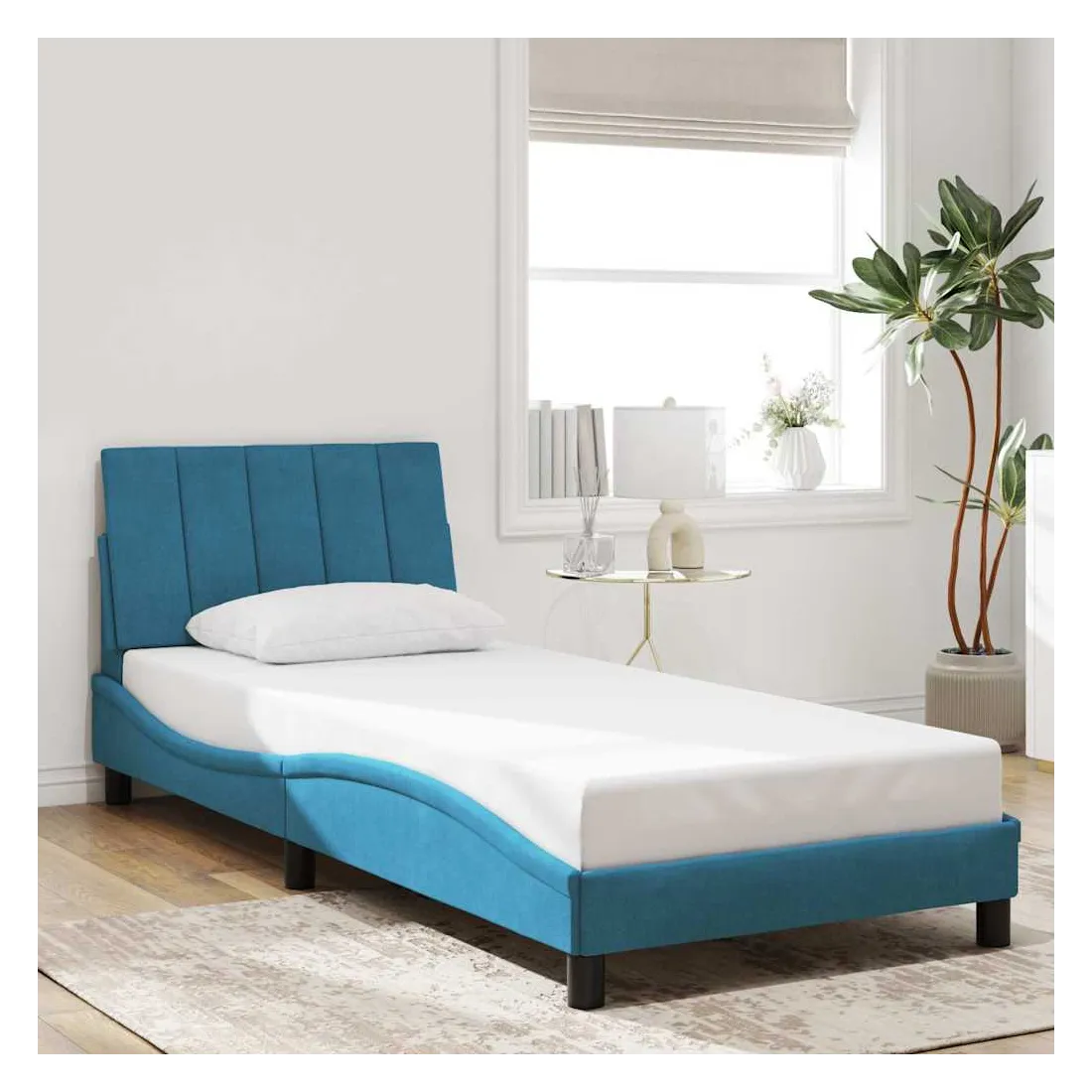 Obtenez une meilleure nuit de sommeil reposante grâce à ce cadre de lit avec tête de lit ! Il est un supplément accueillant à toute chambre à coucher. Velours doux : le velours est un tissu doux et confortable, agréable au toucher.Lattes de contreplaqué : les lattes de contreplaqué assurent une bonne répartition du poids, garantissant que le matelas reste en place à chaque torsion de votre corps pendant le sommeil.Excellent soutien : l'oreiller de tête de lit est rembourré avec de la mousse pour un confort ultra doux et optimal vous offre un excellent soutien du dos lorsque vous êtes assis dans votre lit pour lire ou regarder la télévision.Design pratique : le coussin de la tête de lit est doté d'une fermeture à glissière pour faciliter l'installation, et les bandes auto-agrippantes au dos peuvent être utilisées pour fixer les lampes LED.Design latéral ondulé : l’aspect ondulé du cadre de lit est élégant et sophistiqué, ajoutant une touche moderne et élégante à votre décor, ce qui en fait le point central de votre chambre à coucher. Bon à savoir :Un matelas n'est pas inclus avec ce lit. Nous offrons une sélection variée de matelas. Vous pouvez consulter notre boutique pour trouver un matelas assorti.