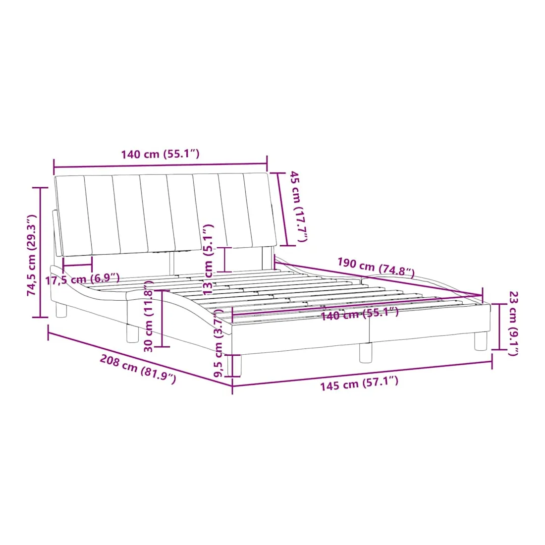 - Dimensions du matelas : 140 x 190 cm (l x L) (matelas non inclus)