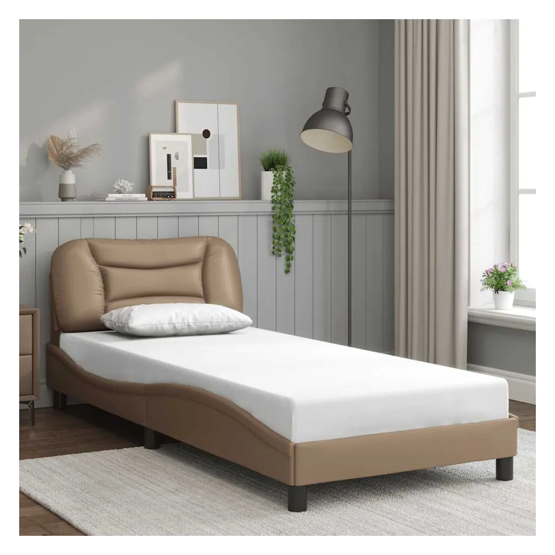 Obtenez une meilleure nuit de sommeil reposante grâce à ce cadre de lit avec tête de lit ! Il est un supplément accueillant à toute chambre à coucher. Similicuir durable : le similicuir de qualité supérieure est un matériau très durable. Il est résistant aux taches, ce qui le rend facile à nettoyer avec un chiffon humide. La surface lisse donne également un aspect luxueux et la beauté du cuir véritable.Lattes de contreplaqué : les lattes de contreplaqué assurent une bonne répartition du poids, garantissant que le matelas reste en place à chaque torsion de votre corps pendant le sommeil.Excellent soutien : l'oreiller de tête de lit est rembourré avec de la fibre de polypropylène pour un confort ultra doux et optimal vous offre un excellent soutien du dos lorsque vous êtes assis dans votre lit pour lire ou regarder la télévision.Design latéral ondulé : l’aspect ondulé du cadre de lit est élégant et sophistiqué, ajoutant une touche moderne et élégante à votre décor, ce qui en fait le point central de votre chambre à coucher. Bon à savoir :Un matelas n'est pas inclus avec ce lit. Nous offrons une sélection variée de matelas. Vous pouvez consulter notre boutique pour trouver un matelas assorti.