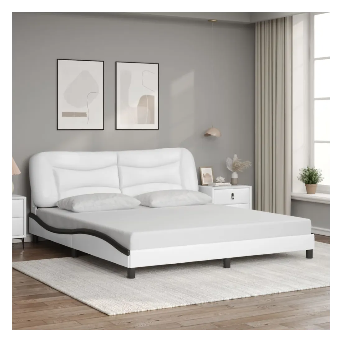 Obtenez une meilleure nuit de sommeil reposante grâce à ce cadre de lit avec tête de lit ! Il est un supplément accueillant à toute chambre à coucher. Similicuir durable : le similicuir de qualité supérieure est un matériau très durable. Il est résistant aux taches, ce qui le rend facile à nettoyer avec un chiffon humide. La surface lisse donne également un aspect luxueux et la beauté du cuir véritable.Lattes de contreplaqué : les lattes de contreplaqué assurent une bonne répartition du poids, garantissant que le matelas reste en place à chaque torsion de votre corps pendant le sommeil.Excellent soutien : l'oreiller de tête de lit est rembourré avec de la fibre de polypropylène pour un confort ultra doux et optimal vous offre un excellent soutien du dos lorsque vous êtes assis dans votre lit pour lire ou regarder la télévision.Design latéral ondulé : l’aspect ondulé du cadre de lit est élégant et sophistiqué, ajoutant une touche moderne et élégante à votre décor, ce qui en fait le point central de votre chambre à coucher. Bon à savoir :Un matelas n'est pas inclus avec ce lit. Nous offrons une sélection variée de matelas. Vous pouvez consulter notre boutique pour trouver un matelas assorti.