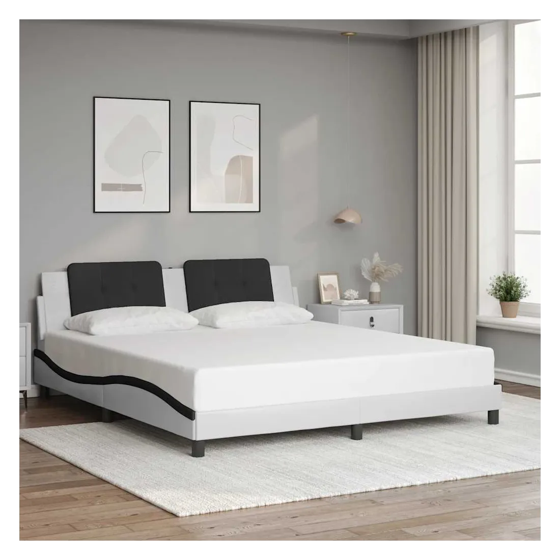 Obtenez une meilleure nuit de sommeil reposante grâce à ce cadre de lit avec tête de lit ! Il est un supplément accueillant à toute chambre à coucher. Similicuir durable : le similicuir de qualité supérieure est un matériau très durable. Il est résistant aux taches, ce qui le rend facile à nettoyer avec un chiffon humide. La surface lisse donne également un aspect luxueux et la beauté du cuir véritable.Lattes de contreplaqué : les lattes de contreplaqué assurent une bonne répartition du poids, garantissant que le matelas reste en place à chaque torsion de votre corps pendant le sommeil.Excellent soutien : l'oreiller de tête de lit est rembourré avec de la mousse pour un confort ultra doux et optimal vous offre un excellent soutien du dos lorsque vous êtes assis dans votre lit pour lire ou regarder la télévision.Design pratique : le coussin de tête de lit est doté d'une fermeture éclair pour une installation facile.Design latéral ondulé : l’aspect ondulé du cadre de lit est élégant et sophistiqué, ajoutant une touche moderne et élégante à votre décor, ce qui en fait le point central de votre chambre à coucher. Bon à savoir :Un matelas n'est pas inclus avec ce lit. Nous offrons une sélection variée de matelas. Vous pouvez consulter notre boutique pour trouver un matelas assorti.